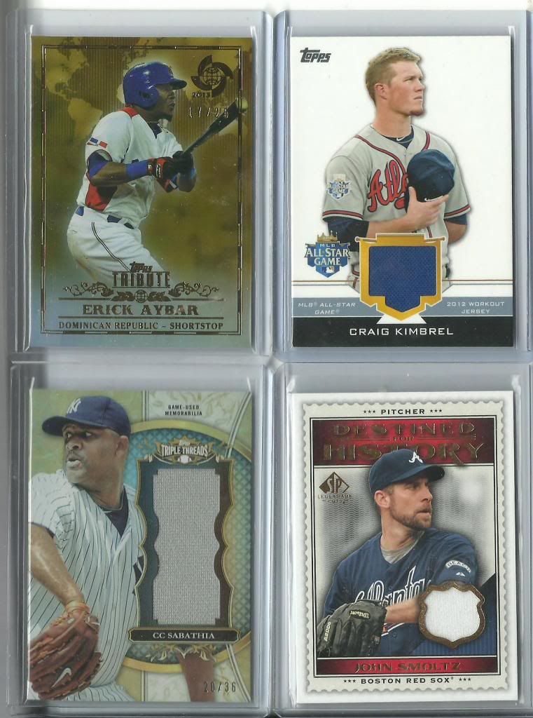 Craig Kimbrel Braves Topps Tribute WBC patch /131 $8.00 John Smoltz Braves 2009 Destined For History patch $3.00 I will take them pending the scan. |