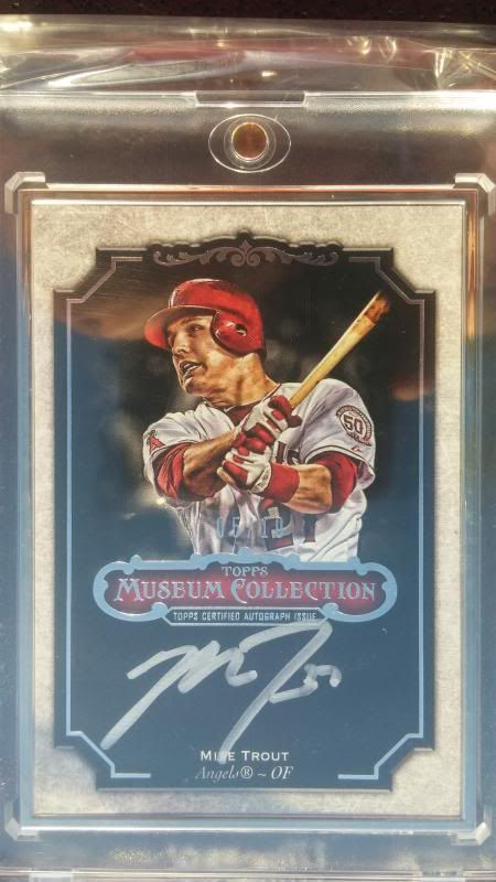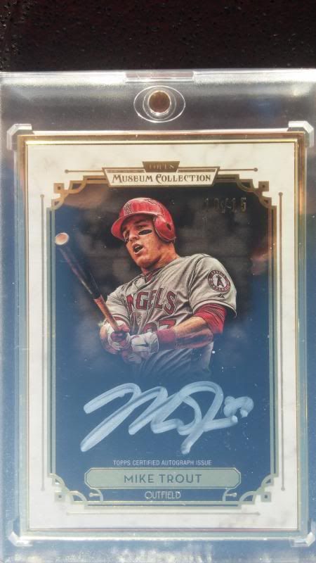 I am willing to trade for the following cards: Buster Posey museum collection gold framed auto numbered to 15 or 2005 bowman chrome jered weaver gold refractor auto numbered to 50 I only ship in the US and both cards will be shipped in magnetic cases with signature confirmation. 2012 Museum Collection Mike Trout Silver Framed Auto 5/10 ![]() 2014 Museum Collection Mike Trout Gold Framed Auto 10/15