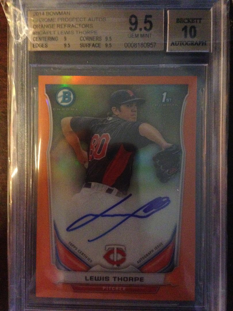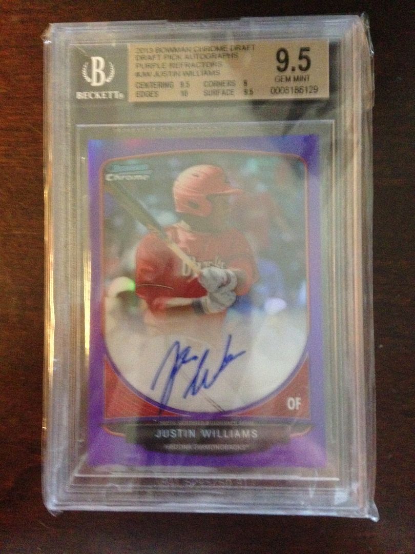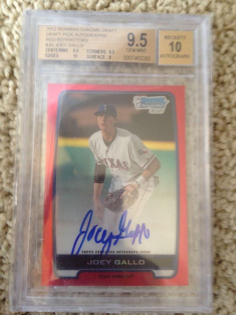 Bryant Black auto refractor: $OLD #23/99 (hasn't been graded; just received) ![]() ![]() Baez Blue GEM auto refractor: $430 PRICE REDUCED ![]() Alcantrara Purple refractor (VERY high chance it gems): $575 #1/10 (hasn't been graded) - SOLD for a comparison, check here: 2013 Bowman Chrome Arismendy Alcantara Purple Refractor Auto 10 Cubs | eBay Card is already at 430 w/ a day plus; and it isn't as perfectly centered as this one, nor is it the first in the series. ![]() ![]() Lewis Thorpe Orange auto refractor GEM 9.5/10. Tough 10 auto: $275 ![]() Polanco Bowman Chrome auto GEM: $150 2 x 10 subs ![]() Justin Williams Bowman Chrome purple auto refractor GEM: $400 ![]() Justin Williams Bowman Chrome auto PRISTINE: $100 ![]() Taijuan Walker Bowman Chrome auto Blue Wave GEM: $125 PRICE REDUCED ![]() Joey Gallo Bowman Chrome auto Red GEM: $4975 There are 2 red 9.5s, but this is the only 9.5/10 GEM MINT. Pop 1. ![]() Joey Gallo Bowman Chrome auto Purple TRUE GEM: $2675 There are 3 purple 9.5/10s. This is the highest graded of those, with no sub below 9.5.