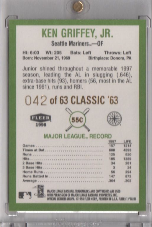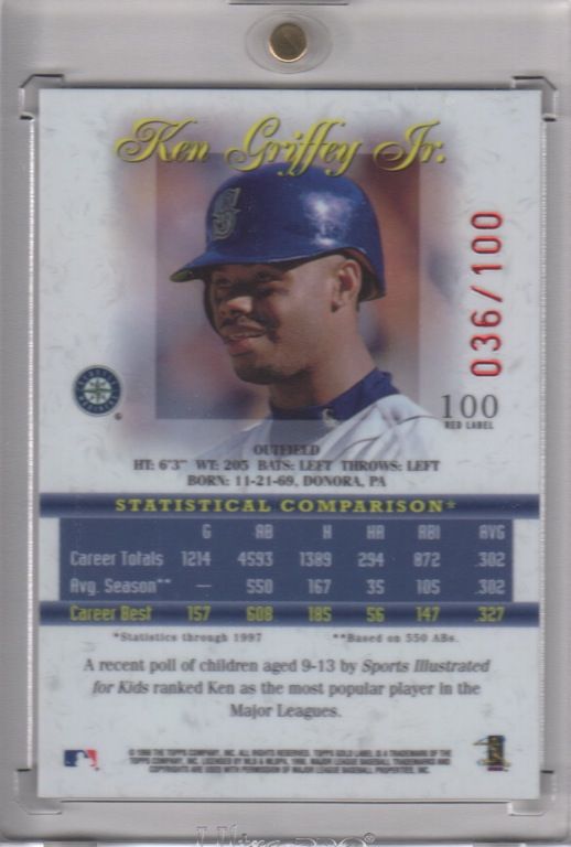 One thing that stands out to me, above others, about my collection and fandom of Griffey, is the fact that he played the game the right way. He has never been accused of any wrong-doing to the game, and he played with a smile on his face for 20+ years. I'm glad I picked the "right" guy! Thanks, Chris Last edited by Griff24fan; 10-20-2014 at 12:48 AM. |