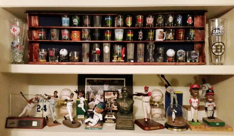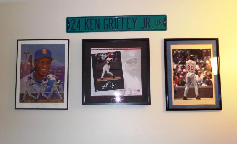 My name is Chris Diesel, aka griff24fan on eBay, and cdgriff from the old Beckett Messageboards. I see a few names in here that I recognize from eBay and those old Beckett boards. I've been collecting Griffey for almost 22 years, now, starting at age 10. I pulled his card from a pack of '92 Pinnacle, at Christmas that year, and haven't stopped since. At one point, I had over 2600 different cards of him. Over the past 5 years, or so, I've been selling off a large portion of my collection. I started with a lot of 850 base and low-dollar insert cards, and have been selling piece by piece, since then. I still do an eBay search, every day, and am still building my Griffey autograph collection. Here's a collage of what the auto collection looks like, these days: ![]() Here's the "Griffey shelf" and shot glass collection shelves, in my living room: ![]() My home office is decked out, too: ![]() Good to "see" a lot of you guys again! Diesel Last edited by Griff24fan; 12-01-2014 at 10:56 AM. |