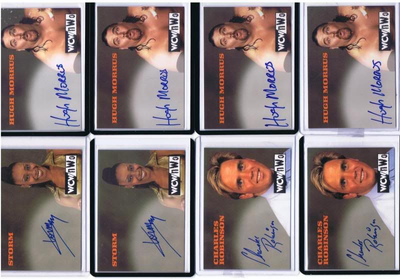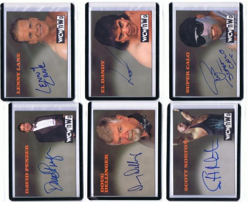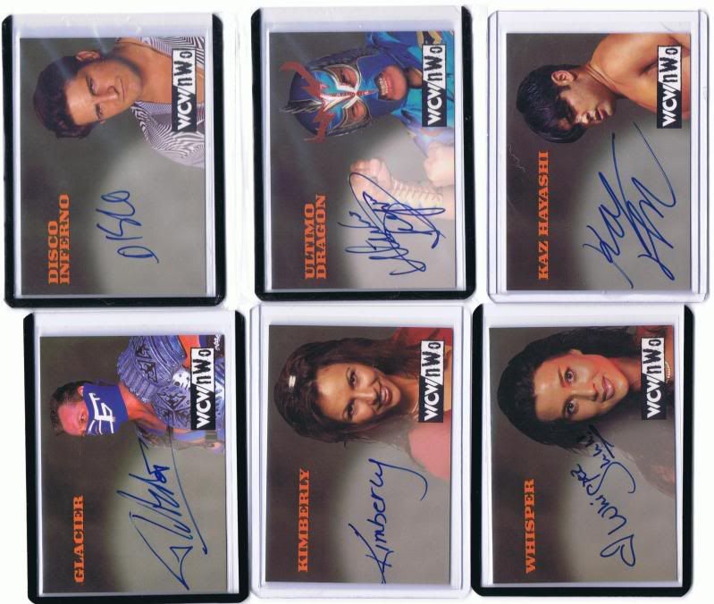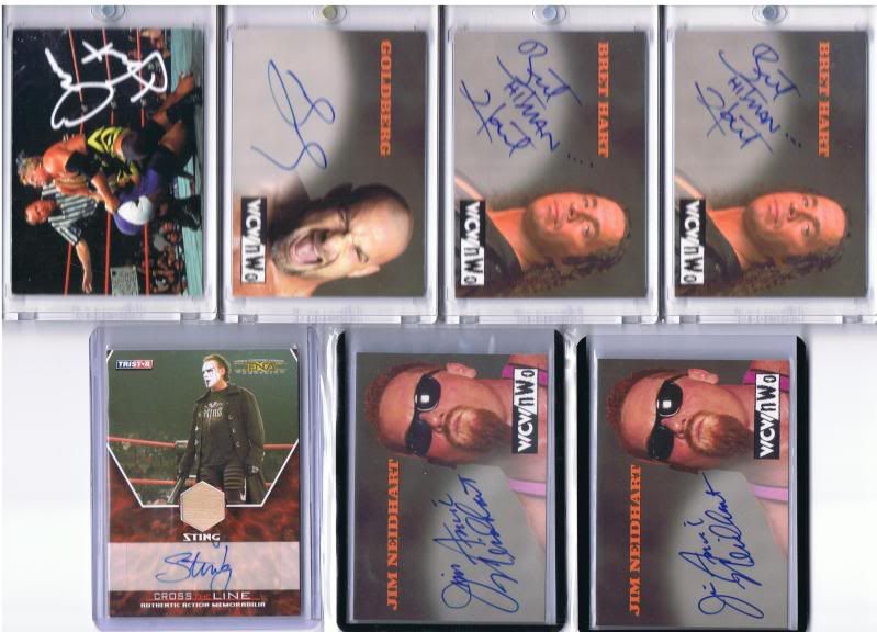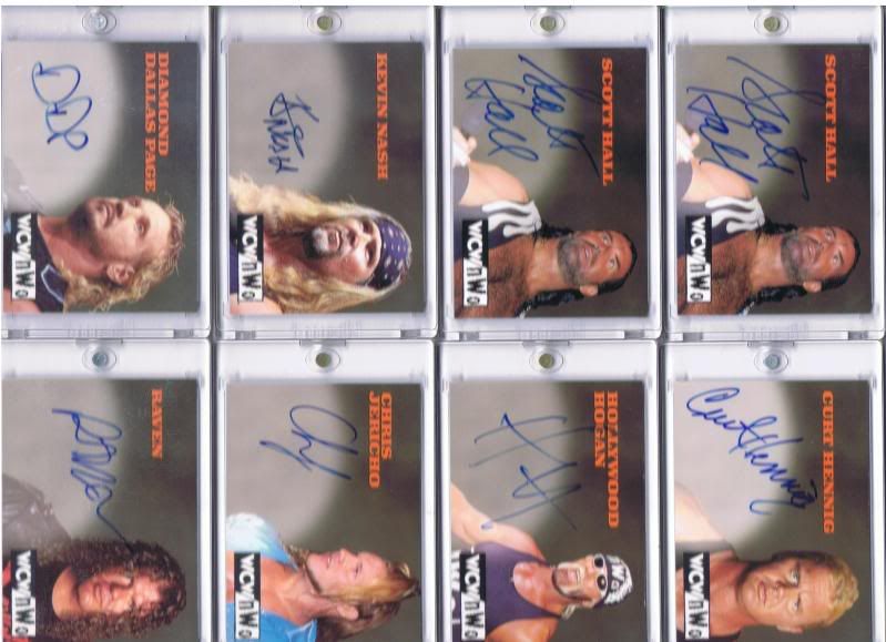 Hey guy's,never been on the forums before,aussie collector of the three series wcw/nwo auto's,have about 570 now in collection,luuv this set,never had the heart to sell any,only ones missing are flair,bulldog,was outbid on both booker sold in aussie and enos,only look for varients now,by the way nice collection sj,i have a hart signed on the back,awesome auto,i think from memory i have a hh and three signed hollywood front or back auto's as well,have thousands of auto's now,have the unreleased 1998 duocards set of undertaker sweet card,animal,henry & x pac,many 2005 wwe heritage auto's,you can never get enough of the hand signed on card auto's,also the 1994 action packed #1/500 undertaker and #1/500 savage,and my favorite photo of andre the giant being interviewed by buddy rodgers and signed by both,well thats all i can remember without checking at the moment,if i get time and i can find them,i have filing cabinets full of boxes of auto's, i can post photo's of any you'd like to see,cheers from australia.