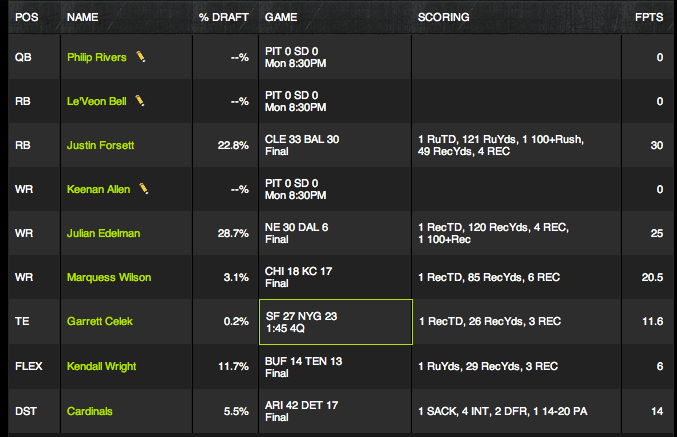 QB Carson Palmer 18.34 lock RB Todd Gurley 18.9 lock RB Dion Lewis 23.3 lock WR Julian Edelman 25 lock WR Larry Fitzgerald 16.8 lock WR Jeremy Maclin 16.5 lock TE Antonio Gates 0 swap out FLEX Devonta Freeman 35.7 lock DST Broncos 20 lock