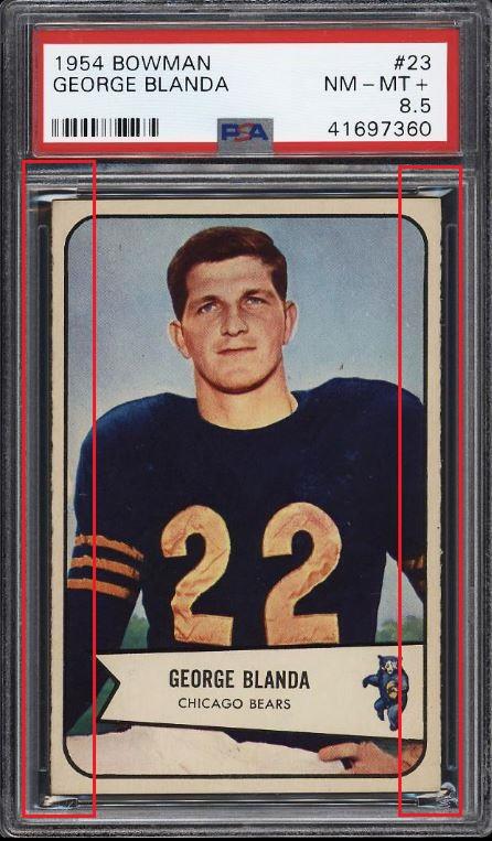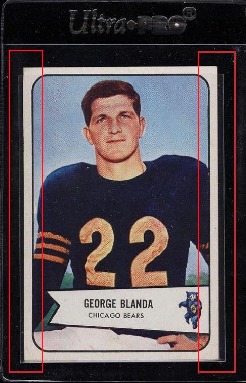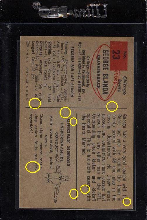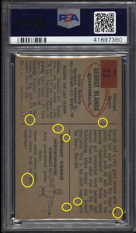 1954 Bowman George Blanda RC #23 Value gain of $704.95 This card was purchased by whitman111 (Gary Moser) from PWCC as a raw ungraded copy on August 23, 2017 for $71.05. PWCC Marketplace link: https://www.pwccmarketplace.com/items/1534239 Same card was sold by PWCC as a PSA-8.5 for $776.00 on November 18, 2018. PWCC Marketplace link: https://www.pwccmarketplace.com/items/1857625 Yellow circles are print and fiber identifiers. Red squares show obvious rough cut trimming to two sides. Brent calls this "pack fresh". Possible color touching to spots on jersey (could be scanning specs). ![]() ![]() ![]()