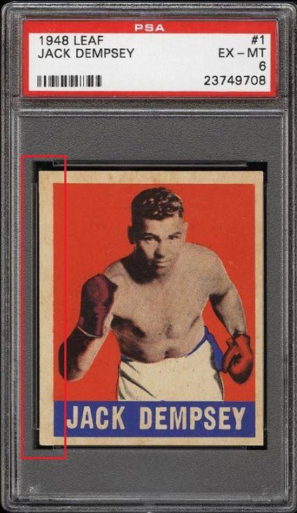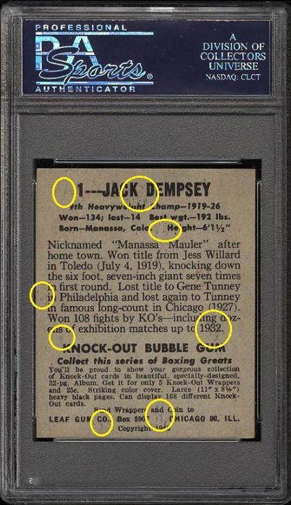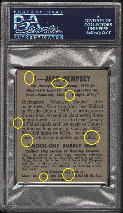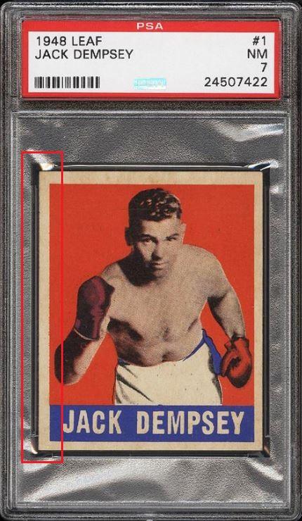 1948 Leaf Jack Dempsey #1 Value gain of $377.50 This card was purchased by whitman111 (Gary Moser) from PWCC as a PSA-6 on May 26, 2015 for $177.50. PWCC Marketplace link: https://www.pwccmarketplace.com/items/1117286 Same card was sold by PWCC as a PSA-7 for $555.00 on October 21, 2015. PWCC Marketplace link: https://www.pwccmarketplace.com/items/1178940 Yellow circles are print and fiber identifiers. Red squares show left edge was trimmed. ![]() ![]() ![]()