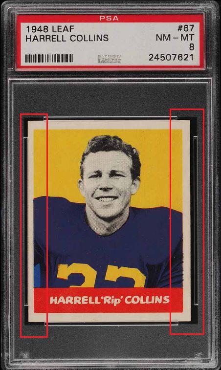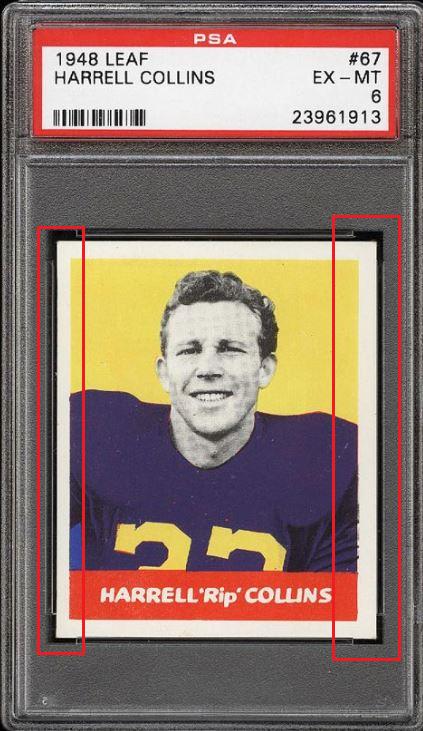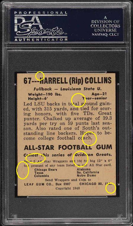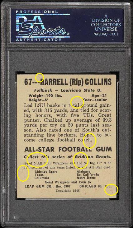 1948 Leaf Harrell Collins #67 Value gain of $283.62 This card was purchased by whitman111 (Gary Moser) from PWCC as a PSA-6 on May 20, 2015 for $149.50. PWCC Marketplace link: https://www.pwccmarketplace.com/items/1115127 Same card was sold by PWCC as a PSA-8 for $433.12 on March 24, 2019. PWCC Marketplace link: https://www.pwccmarketplace.com/items/1932432 Yellow circles are print and fiber identifiers. Red squares show trimming to both sides. ![]() ![]() ![]()