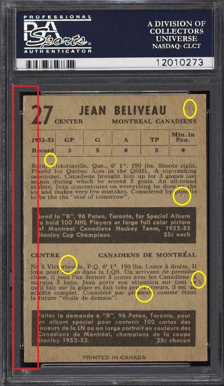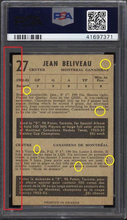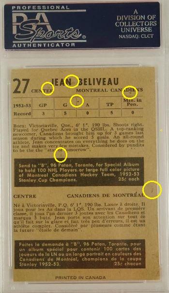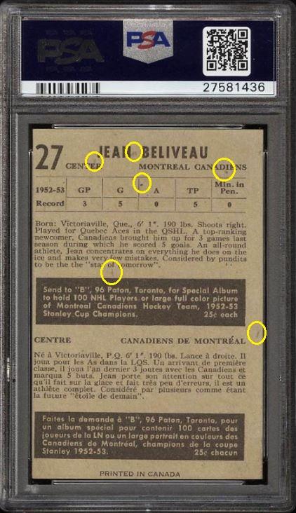 1953 Parkhurst Jean Beliveau RC #27 Value gain of $2,206.00 This card was purchased by whitman111 (Gary Moser) from somatg3 as a PSA-5 on January 05, 2017 for $560.00. Worthpoint link: https://www.worthpoint.com/worthoped...eal-1848680697 Same card was sold by PWCC as a PSA-7 for $2,766.00 on September 26, 2017. PWCC Marketplace link: https://www.pwccmarketplace.com/items/1552269 From the PSA-7 PWCC listing description: "A wonderfully preserved specimen..." Yellow circles are print and fiber identifiers. I have confirmed four fibers on the back which makes it a match. Red squares show a trimmed edge. ![]() ![]() ![]()