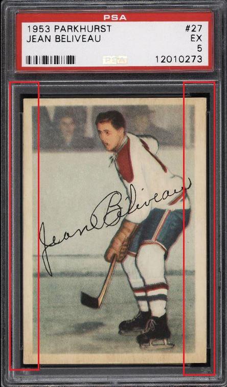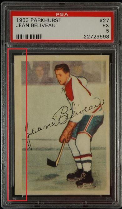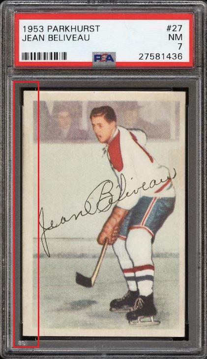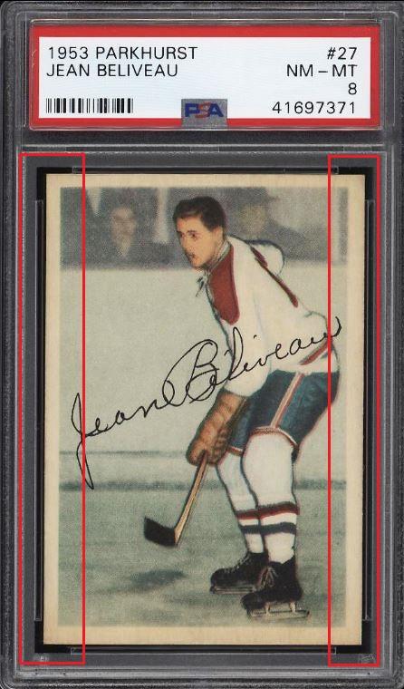 1953 Parkhurst Jean Beliveau RC #27 Value gain of $6,007.00 This card was purchased by whitman111 (Gary Moser) from PWCC as a PSA-6 on June 24, 2018 for $748.00. PWCC Marketplace link: https://www.pwccmarketplace.com/items/1678679 Same card was sold by PWCC as a PSA-8 for $6,755.00 on November 21, 2018. PWCC Marketplace link: https://www.pwccmarketplace.com/items/1859814 Yellow circles are print and fiber identifiers. Red squares show trimmed edges. ![]() ![]() ![]()