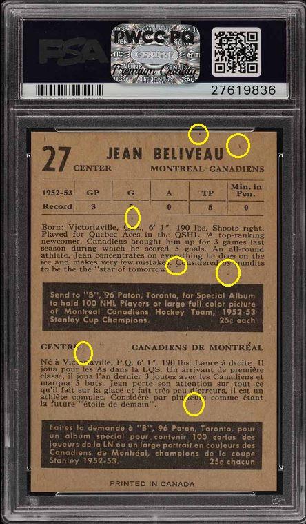 1953 Parkhurst Jean Beliveau RC #27 Value gain of $8,341.87 This card was purchased by whitman111 (Gary Moser) from PWCC as a PSA-8 on December 18, 2016 for $8,313.13. PWCC Marketplace link: https://www.pwccmarketplace.com/items/1399668 Same card was sold by PWCC as a PSA-8.5 for $16,655.00 on March 25, 2019. PWCC Marketplace link: https://www.pwccmarketplace.com/items/1934581 Yellow circles are print and fiber identifiers. Red squares show the two corners mentioned in the PSA-8 listing description as having "very light touches to the right two corners". ![]() ![]() ![]()