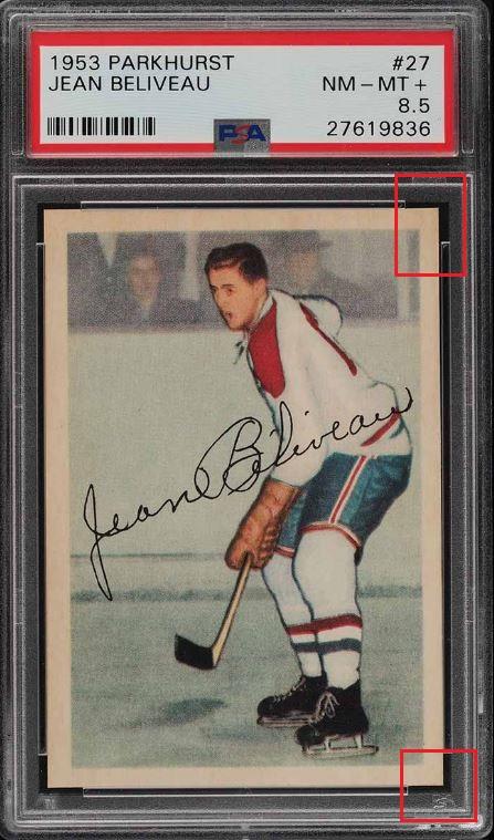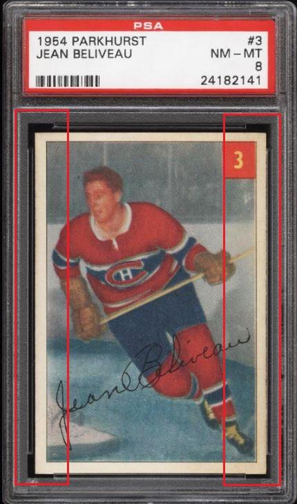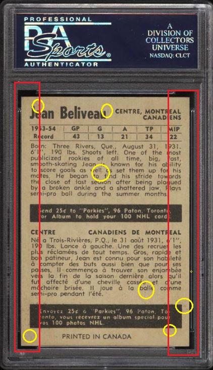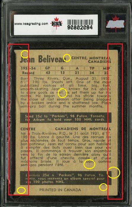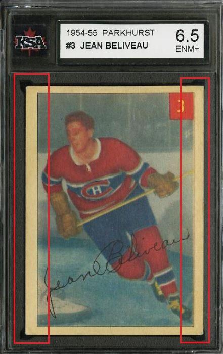 1954 Parkhurst Jean Beliveau #3 Value gain of approximately $1,000.00 This card was purchased by whitman111 (Gary Moser) from PWCC as a KSA-6.5 on February 16, 2015 for $around $100.00 (comp value). PWCC Marketplace link: https://www.pwccmarketplace.com/items/1072514 Same card was sold by PWCC as a PSA-8 for $1,100.00 on August 02, 2016. PWCC Marketplace link: https://www.pwccmarketplace.com/items/1319661 Note from the PWCC listing description: "Pack fresh with near perfect centering, sharp corners and impressive edges." Yellow circles are print and fiber identifiers. Red squares show obvious trimming of edges. Card has been cleaned and is now much whiter. ![]() ![]() ![]()