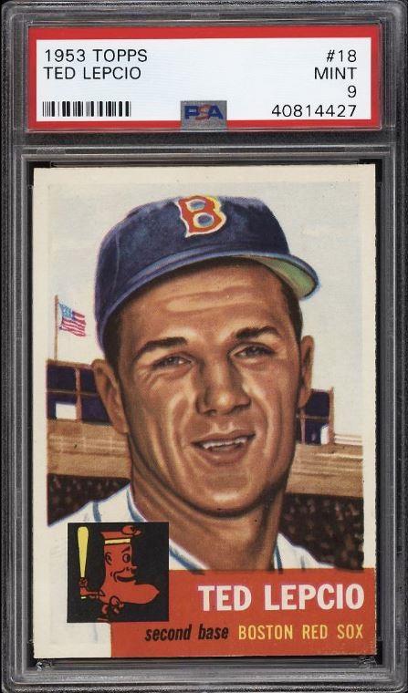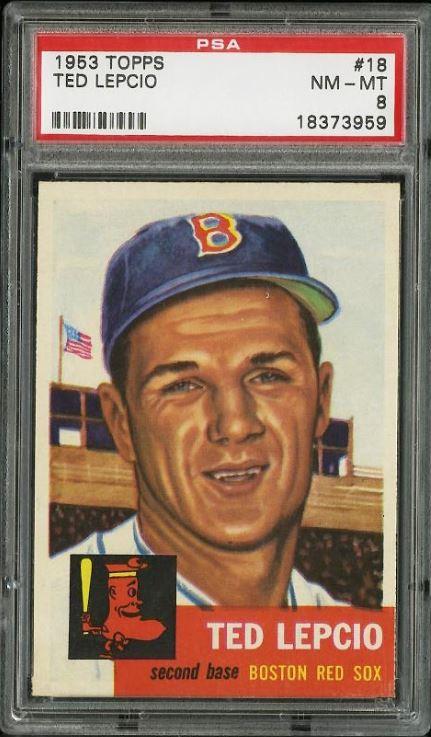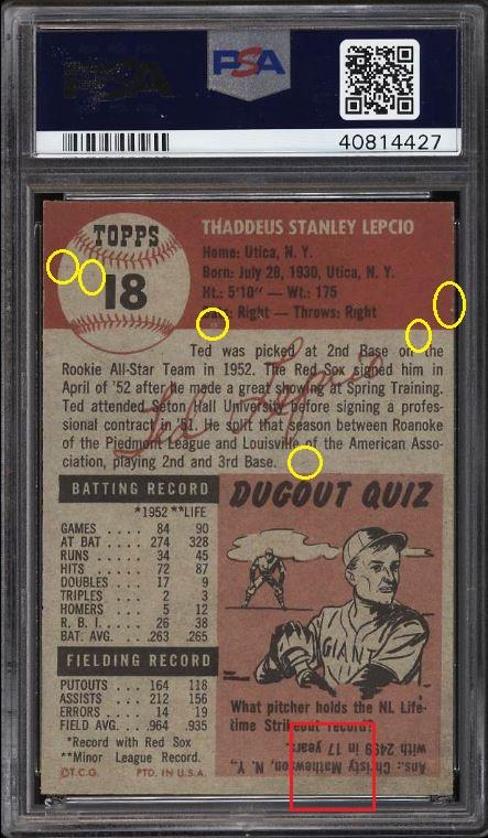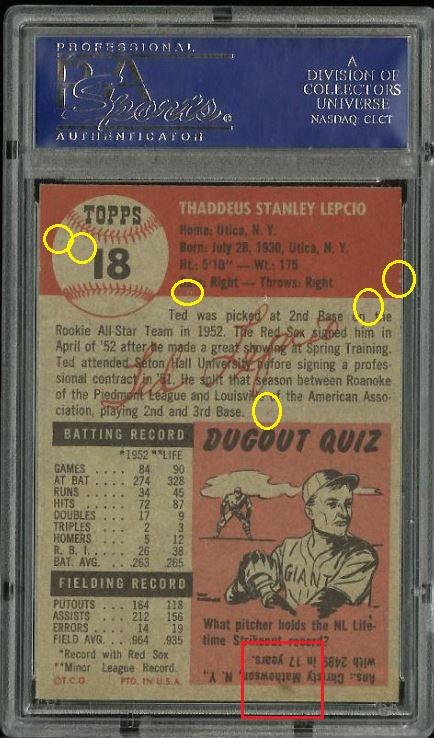 1953 Topps Ted Lepcio #18 Value gain of $762.85 This card was purchased by whitman111 (Gary Moser) from PWCC as a PSA-8 on March 09, 2015 for $136.00. PWCC Marketplace link: https://www.pwccmarketplace.com/items/1077077 Same card was sold by PWCC as a PSA-9 for $898.85 on July 09, 2018. PWCC Marketplace link: https://www.pwccmarketplace.com/items/1688315 Yellow circles are print and fiber identifiers. Red squares show the stain removed from the back that created a grade bump. ![]() ![]() ![]()