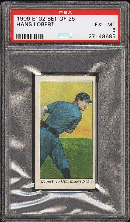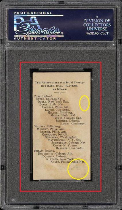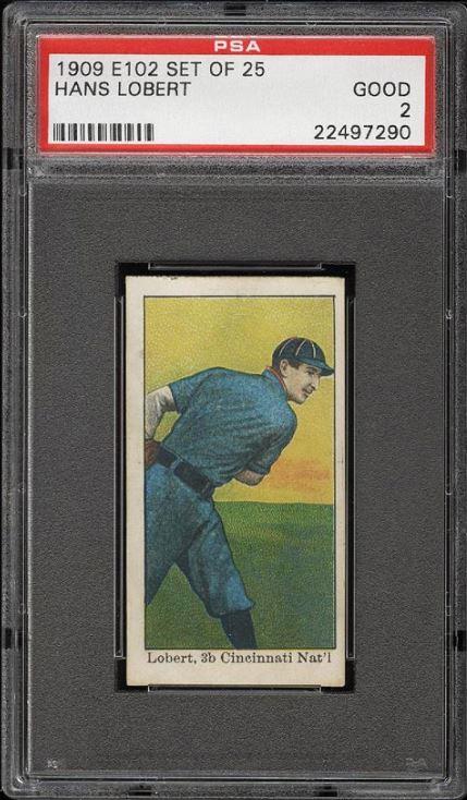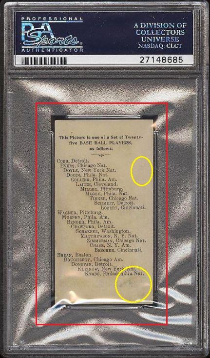 1909 E102 Set Of 25 Hans Lobert - POP 1 - none graded higher Value gain of $313.50 This card was purchased by whitman111 (Gary Moser) from PWCC as a PSA-2 on February 04, 2015 for $123.50. PWCC Marketplace link: https://www.pwccmarketplace.com/items/1064212 Same card was sold by PWCC as a PSA-6 for $437.00 on May 07, 2017. PWCC Marketplace link: https://www.pwccmarketplace.com/items/1484480 Yellow circles are print and fiber identifiers. Red squares show the large scale stain removed from the back. ![]() ![]() ![]()