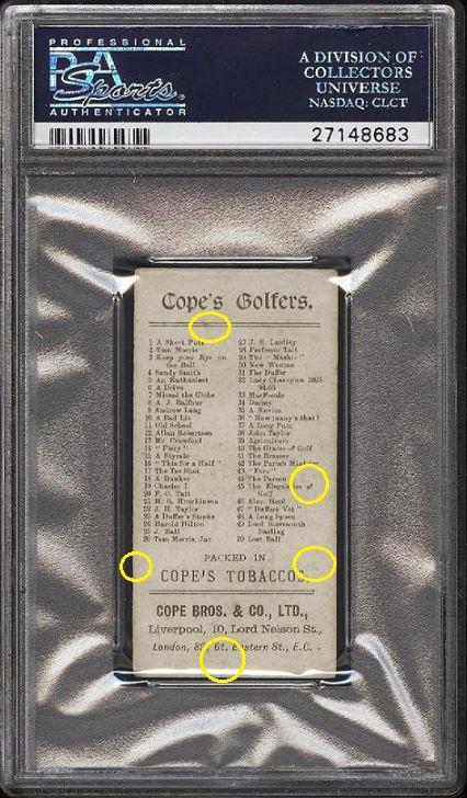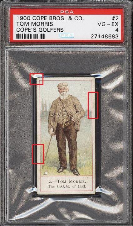 1900 Cope Golfers Tom Morris #2 Value gain of $351.76 This card was purchased by whitman111 (Gary Moser) from PWCC as a PSA-2 on Jul 28, 2016 for $406.00. PWCC Marketplace link: https://www.pwccmarketplace.com/items/1316003 Same card was sold by PWCC as a PSA-4 for $757.76 on May 23, 2017. PWCC Marketplace link: https://www.pwccmarketplace.com/items/1494648 Yellow circles are print and fiber identifiers. Red squares show the stains removed from the front. ![]() ![]() ![]()