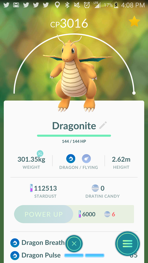 this dragonite is only like 68.9, but it was a near max cp dratini and i wanted a good dragonite. my other dragonites are cp 153 and 143 that i caught in the wild lol. i do have 93.3 and 91.1 dratinis but they are only cp 139 and 87 respectively.. yeah i don't have the patience for that.