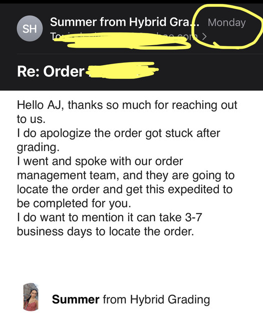 I am disgusted by this place. It’s ran by the local trailer park. Their owner is an uneducated simp and it’s no wonder this place has become a circus. I have 4 cards left with them. They’ve been there since Sept 2021. They put a managers rush on my order and it started to move but now has been stuck on “grading” for 3 weeks. I will include the ALARMING response I got from them after I asked why they were stuck on grading….