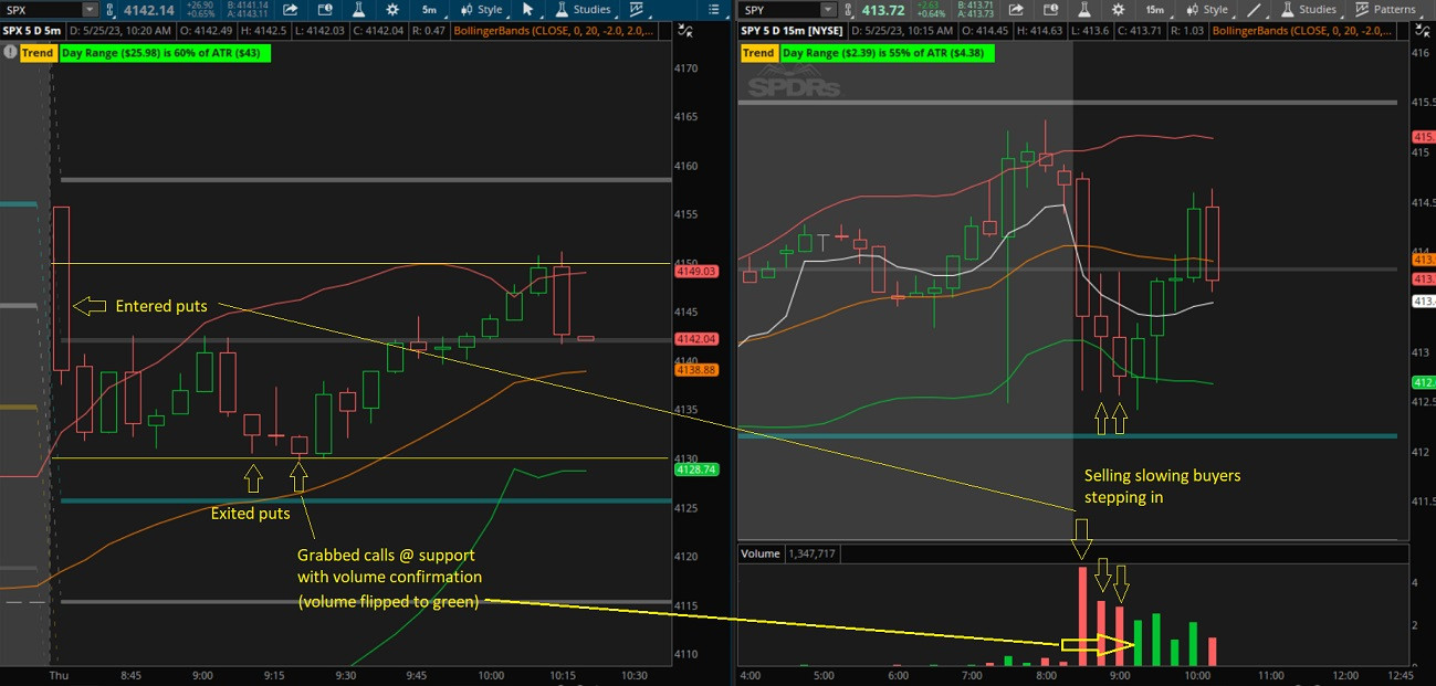 Trade recap: Calling it a day here. I'll be looking for calls off the open.❌ - went into the day with bias. I was expecting a pull back off the open to get into calls, but not that big of a pull back. So when I saw strong selling volume coming in I grabbed some puts (basically chased because I wasn't really looking for puts). SPX: 4150 key level✅- at the break below with volume I grabbed some puts. SPX 4130 support✅- took calls here and I will let this position run for a while. I'm ITM and in profits so I set my hard stop in profits - I'll get stopped out at +$800. ![]() ![]() Education: What I saw and was watching ![]() ----------------------- Added: I got stopped out of calls while making the post Last edited by Blazed; 05-25-2023 at 10:40 AM. |