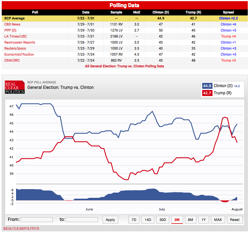 Some fairly poor polling numbers for Trump over the last couple of days. DNC bounce no doubt. Be interesting to see where the dust settles over the next couple of days.