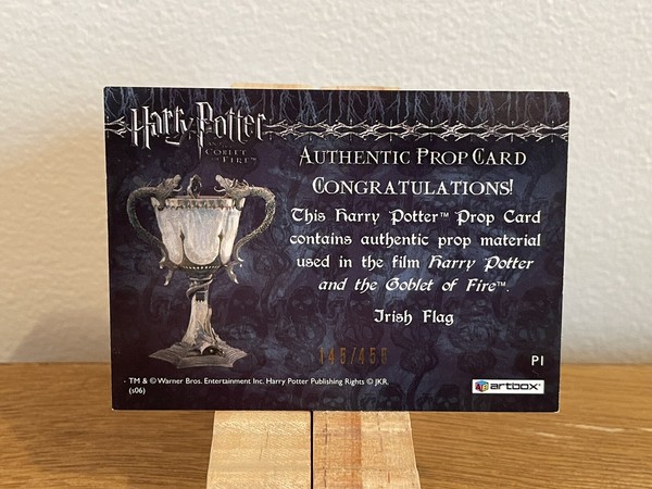 It just says 'Trophy', I feel like it would say 'Tri-Wizard Cup' if it was really that. 'Trophy' has me thinking it could be one of those zillions of trophies in the trophy room. The room in which Dumbledore shoves Harry asking him if he put his name in the goblet of fire, and shown on the front of the card. Maybe Im wrong and it has to be the item pictured on the back, but especially with the wording of Trophy and also the text on it, which seems to say 'prize', it's probably from one of the generic trophies in that big room (sorry, I realize probably not the news you want. It's looks like a neat, rare prop card either way only #/d /105, which is quite low in the HP world). Edit: it is not the item pictured on back on these Goblet of Fire prop cards, the Tri-wizard cup seems to just be on the back generically representing the film it's from. So in this case I think it's very likely it's from one of the many trophies in that trophy room. https://ebay.com/itm/166343520695 Irish Flag Prop: ![]()