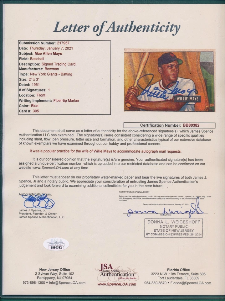 ![]() She didn't sign her own name. I would think this should be rejected -- not a legit WILLIE MAYS autograph. ![]() https://www.ebay.com/itm/Signed-1951....m43663.l10137 ![]()