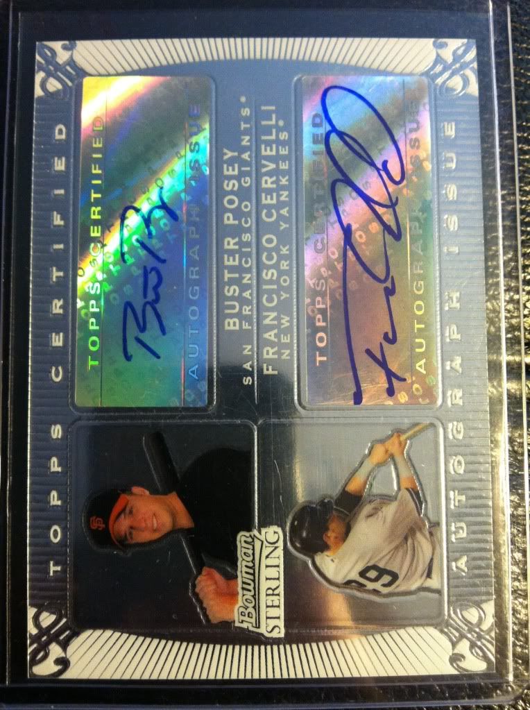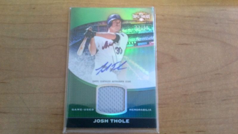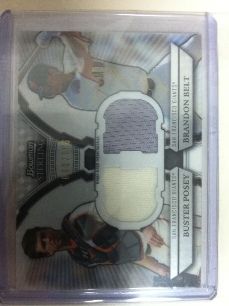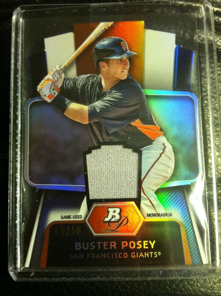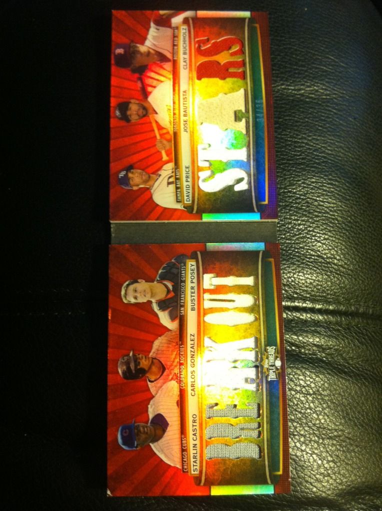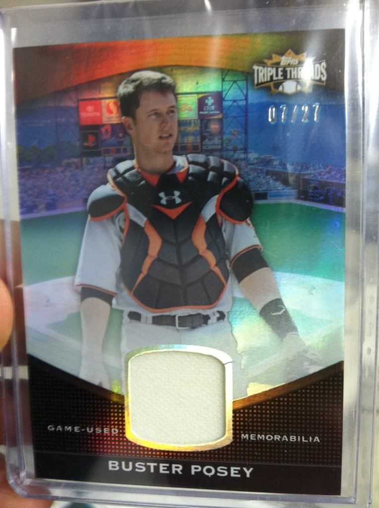 I also have these, but didn't see anything in your bucket I'd take for them, so you'd have to buy: 2009 Tristar Obak Mini Purple Buster Posey 1/1 ![]() 2010 Topps Triple Threads Joe Mauer Booklet /18