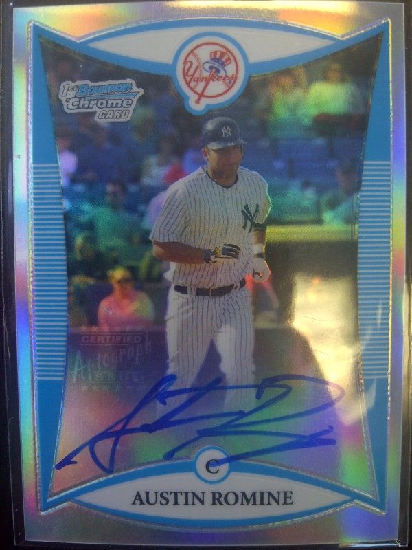 1998 Bowman Chrome Golden Anniversary Refractor Joe DePastino 3/5 2006 Bowman Original Buyback Auto Russel Martin 19/33 2006 UD Ovation Apparel Victor Martinez 2008 Bowman Chrome Prospects Carlos Santana 2009 Topps Chrome Blue Refractor Kenji Johjima 88/199 2009 Upper Deck Signature Stars Game Jersey Ladson Montgomery 2010 Upper Deck DoubleTake Variation Jorge Posada 2010 Upper Deck Gold Rob Johnson 28/99 (Dinged corner) 2011 Topps Manufactured Leather Glove Relic Victor Martinez