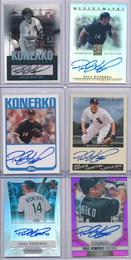 Here's some of my favorite Konerko autos in group scan form. Paul Konerko has played for the Sox between 1999-2014. He has been one of the best players the Sox have ever had, and he is also my favorite player. He has 438 career homeruns and he's the White Sox franchise leader in total bases. He was also the MVP of the 2005 ALCS, and he hit a clutch grand slam in the World Series that year. Thanks!