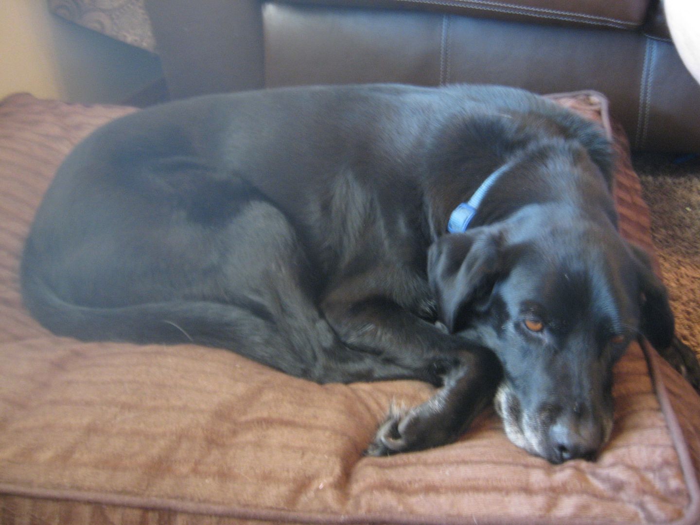 We adopted him when he was about one year old from a local shelter - he is a Black Lab mix. The staff at the shelter had nicknamed him Happy and he is definitely a happy dog. Other than the occasional jail break from the back yard (he learned how to open a fence latch, so now it's padlocked) he is one of the best animals I've ever met. He is turning 12 this year and starting to slow down quite a bit - though he does his best to keep up with my two kids. ![]()