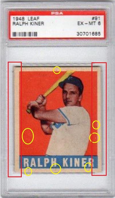 1948 Leaf Ralph Kiner RC #91 Value gain of $780.55 This card was purchased by whitman111 (Gary Moser) from Ebay seller smg79 as a PSA-6 on April 17, 2013 for $175.00. VCP link: https://vintagecardprices.com/card/b...=&limit=999999 Same card was sold by PWCC (Brent and Betsy Huigens) as a PSA-8 for $955.55 on December 02, 2014. PWCC Marketplace link: https://www.pwccmarketplace.com/items/1055085 Yellow circles are print or fiber identifiers. Red boxes identify trimmed left and right edges. No back image supplied from PSA 6 sale. ![]()