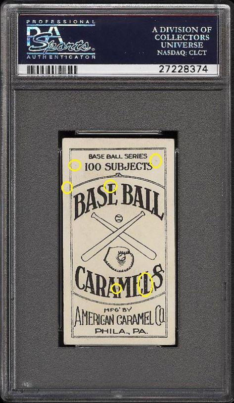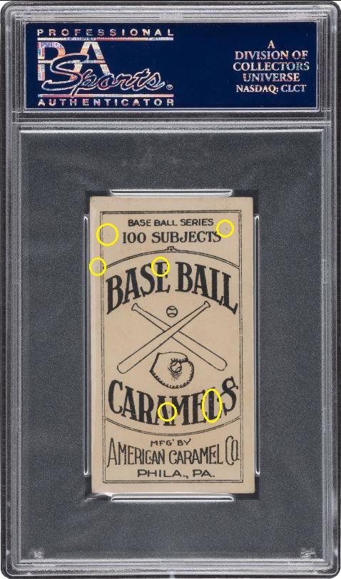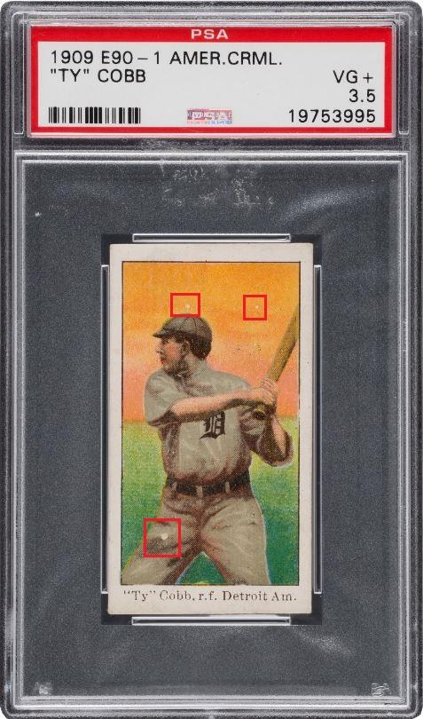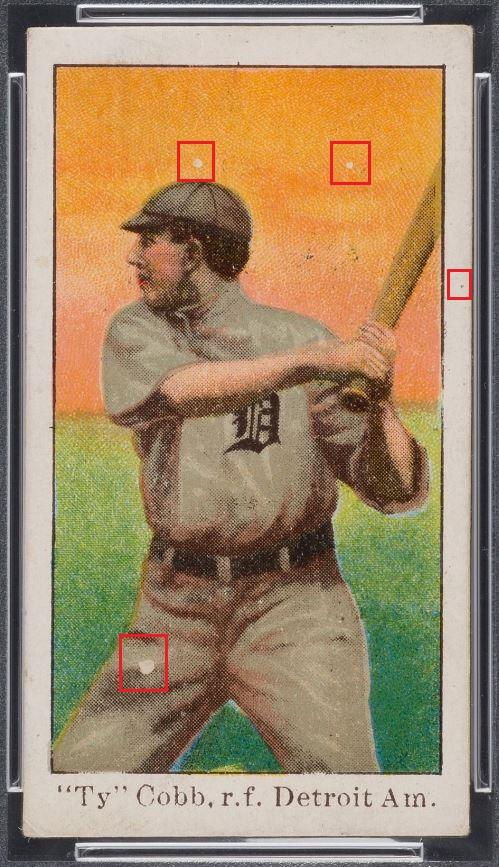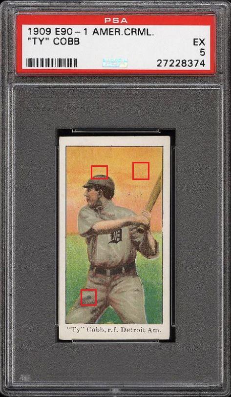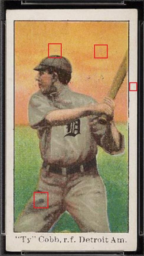 PSA Cert #27228374 1909 E90-1 American Caramel Ty Cobb Value gain of $3,633.01 This card was purchased by an unknown buyer from Heritage Auctions as a PSA 3.5 for $2,868.00 on November 19, 2016. VCP link: https://vintagecardprices.com/card/b.../47707/PSA/3.5 Same card was sold by Ebay seller PWCC as a PSA 5 for $6,501.01 on June 06, 2017. PWCC link: https://www.pwccmarketplace.com/items/1508723 Yellow circles are print, fiber, or chipping identifiers. Red boxes identify areas where color was added. ![]() ![]() ![]() ![]() ![]()