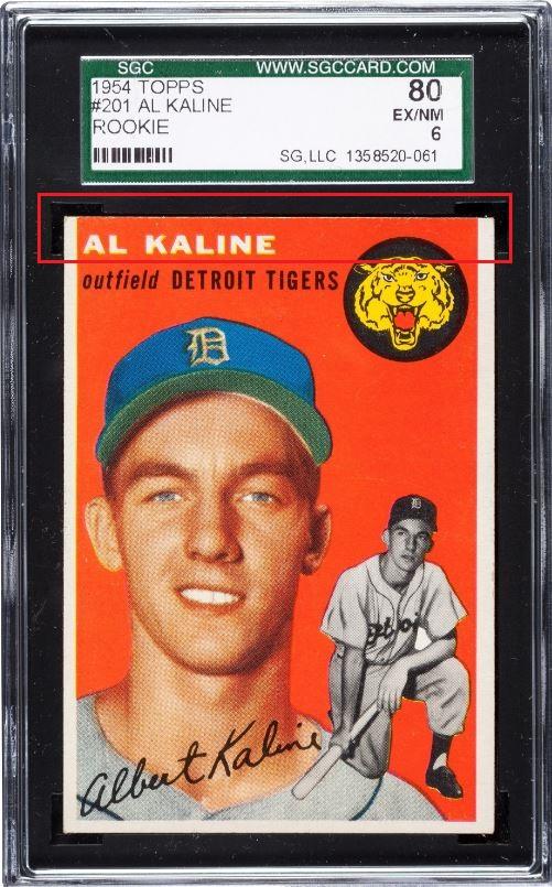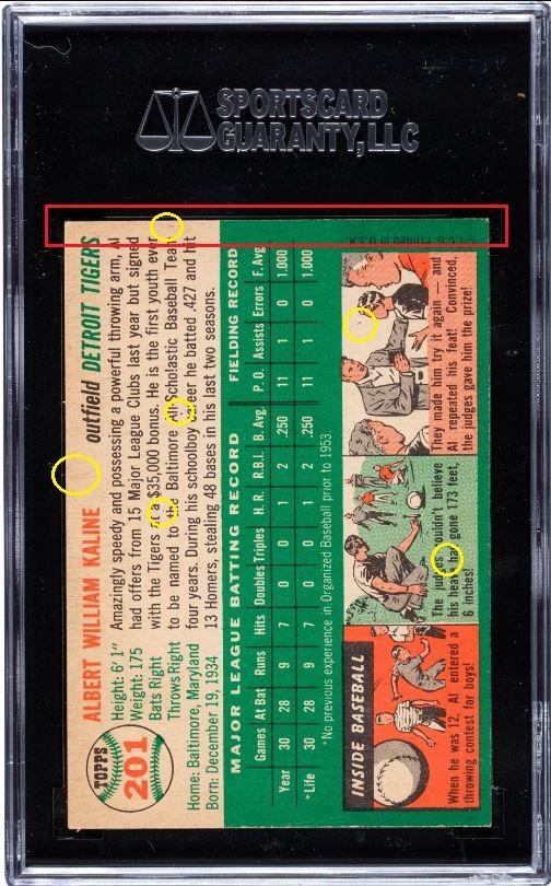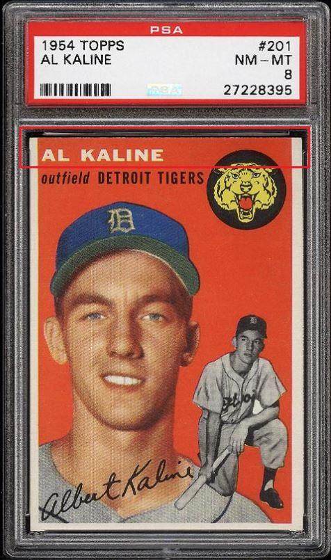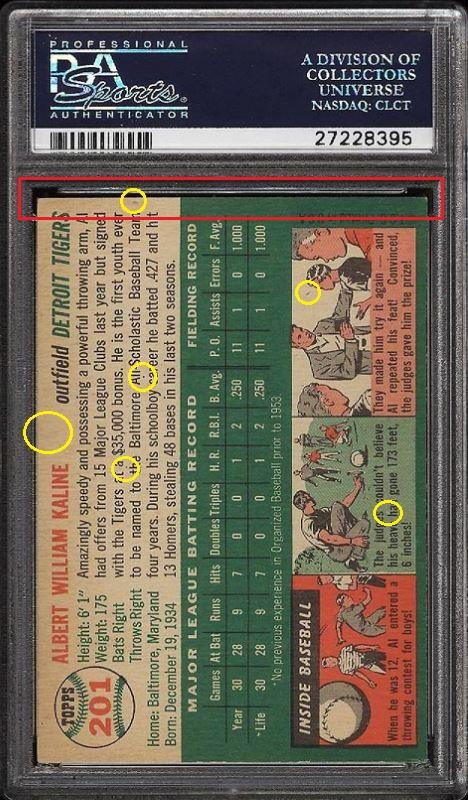 PSA Cert #27228395 1954 Topps Al Kaline #201 Value gain of $2,951.00 This card was purchased by an unknown buyer from Heritage Auctions as a SGC 6 for $657.00 on November 19, 2016. VCP link: https://vintagecardprices.com/card/b...1/67475/SGC/80 Same card was sold by Ebay seller PWCC as a PSA 8 for $3,608.00 on June 07, 2017. PWCC link: https://www.pwccmarketplace.com/items/1510171 Yellow circles are print, fiber, or chipping identifiers. Red box identifies a trimmed top edge. ![]() ![]() ![]() ![]() ![]()