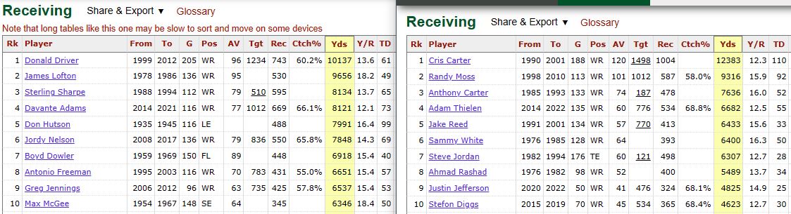 When the NFL produced their list of 100 greatest players of all time, for the 100 anniversary in 2019. These players were on the list: O-Line Forrest Gregg & Cal Hubbard Packers Randall McDaniel Vikings Dan Fortmann Bears Nobody McNever Lions Packers win 2 to 1 over the Vikings and Bears for the best of the best. D-Line Doug Atkins & Bill Hewitt Bears Alan Page & John Randall Vikings. Only 3/4 of a point goes to Vikings, as they shared Page with the Bears. Reggie White Packers 1/4 point Always Garbageski Lions I'll give the Packers the O-Line, and the Bears hold the tie breaker on the D-Line. And we all agree the Lions are trash. And the Vikings only get the WR corp. Deal? Last edited by Grid; 06-26-2023 at 01:11 PM. |