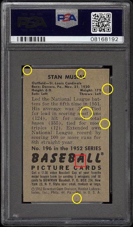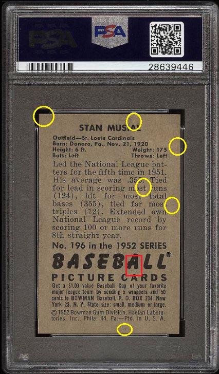 1951 Topps Ringside #93 Marty Servo PSA 7 to PSA 8 Alteration types: Trimming Set Registry status: In a user's private Registry set Sold on 11/21/2017 as a PSA 7 by eBay seller uncommons to whitman111 (Gary Moser's eBay ID) for $34.03 Consigned to PWCC and sold on 3/27/2019 as a PSA 8 for $145.50 Final price: $145.50 Value gain: $111.47 Both the left and right edges of this 1951 Topps Ringside card have been trimmed (boxed in red). The yellow circles are print marks and/or paper fibers which confirm that the two sets of images are of the same exact card. PSA 7: https://vintagecardprices.com/card/b...3/101380/PSA/7 PSA 8: https://www.pwccmarketplace.com/items/1936421 ![]()
