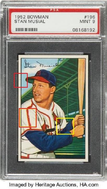1954 Parkhurst #91 Battle of All-Stars PSA 7 to PSA 8 Alteration types: Trimming Set Registry status: I've clearly gone INSANE! Sold on 7/8/2018 as a PSA 7 by eBay seller probstein123 to whitman111 (Gary Moser's eBay ID) for $34.00 Consigned to PWCC and sold on 11/19/2018 as a PSA 8 for $146.50 Final price: $146.50 Value gain: $112.50 This '54 Parkie is trimmed on both its left and right edge (boxed in green). Pink circles are the print spots and flaws that confirm the two sets of images are indeed the same exact card. As a side note, I've never seen a more appropriate name for a Registry set. PSA 7: https://vintagecardprices.com/card/h...91/75002/PSA/7 PSA 8: https://www.pwccmarketplace.com/items/1859836 ![]()