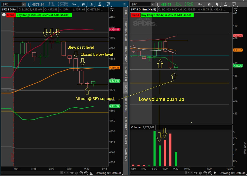 All out of calls since we had trouble with 4393, contracts moved nice. This pump off the open was flow based. Now looking for a 4397 - 4000 reject. If we don't get there I'll get in puts with a close below 4385 on the 5 min. ----------------------------------------------------------------------------- Added Looks like they're holding this level and should go test 4397 - 4400 area. Smart play here would be to wait for "close enough" 4400 and get in puts. Last edited by Blazed; 08-21-2023 at 08:52 AM. |