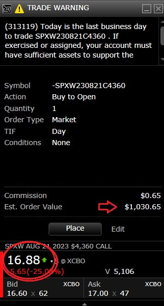 8/18 – OPEX Day, didn’t set any levels, this was based on Blaze stating he wasn’t setting any, but rather just watching ATR levels. Initially SPX rejected 4358 (two points below 4360 ATR) while SPY was rejecting 435.19 ATR, should have entered 4360 Puts here, would have a worked as SPX moved ten points down. SPX did not go any further, note for future scenarios that OPEX may not move very much so taking profits when you have them is best. Whole day SPX did not make significant moves. Next move was 4364 gap (missed this gap), that Blazed mentioned, I hesitated and did not take trade. 4364 worked out to take Puts (4365?), then sell at 4355 (this moved is based on what Blazed posted). I got in at 4360 Puts, one contract (light), held for move lower but should have sold when hit 4355, ended up selling for $50 loss as SPX kept hovering just above 4360. SPX stayed above 4360 the remainder of the day (at least up until 3:13) which would have killed the one 4360 Put I had if I were to have held on to it. Good patience today but should have pulled the trigger on the 4364 gap reject.