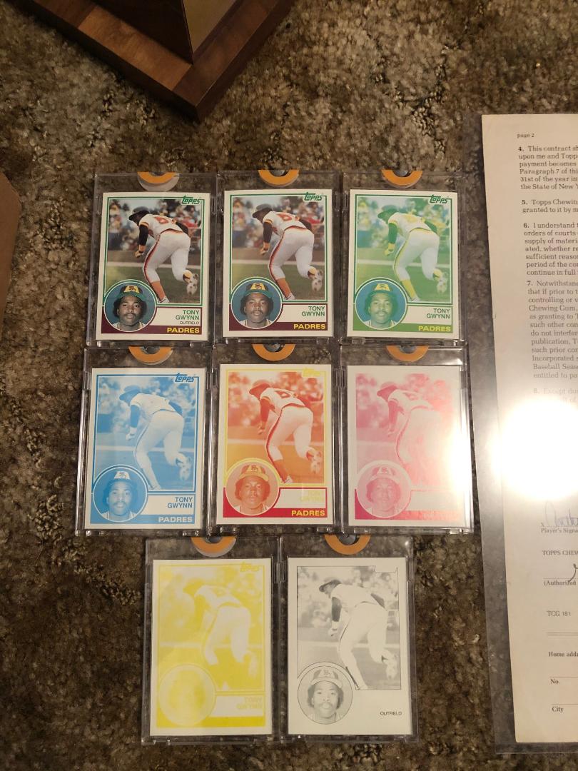 I use to collect cards in the 1990's....at one point I had 4000 different Gwynn Cards...I stopped for years and then collected only Gwynn Game Used Items....which that is all I do today....I had a chance to pick these up a few months back...I had to get them....1 collector had 6 of them and the other had the other 2....I wanted the set of 8 and got them.... The 1983 Tony Gwynn Topps "Color Separation" Rookie Cards..Set of 8....These are 1/1....I also got his Topps Rookie Contract signed from 1981! These are Holy Grail's!