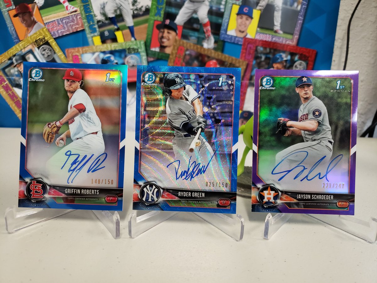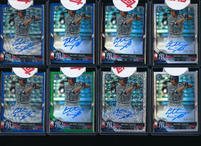 I think that I am not going to make what I spent on these breaks if things keep going as they are. The Superfractor is my biggest card. I was offered $2k for it but I declined as I want to hold onto it. I do not think it is a $2k card but the person who reached out to me is a rabid Yankee fan so I can see why he made that offer. Anthony Seigler is the better seller based on ebay sales but he is going down in price. Ryder wasn't that strong out of the gate in sales department and now I see him creeping even lower, not even holding steady. So yeah, when this is all done I will prob be like maybe $1,000 - $1,500 shy of breaking even. That is, assuming I keep stacking up on low end autos for these 2 guys. If I start hitting Blue or better color for Seigler in particular, I can see a break even point or better. I am not worried though as this is all a gamble. I focus on a draft player or players when I join these auctions and go in with intent to hold and hope they pan out. If I can easily sell base chrome for $1 each + $2.60 shipping, then this is a huge win for me. Not there yet for these guys. not sure when that will be either but it's all good as I am not in a rush. I rather not sell their base chrome in bulk just yet either. My OP has my Google Sheet you can look at for results per break - if anyone want's to take on the math project when I an done with totals, rock out. I wont be doing it. The Gorman spot is a beast of a spot but keep in mind that it could of easily been the opposite. You just pay up and hold on for dear life basically, lol.