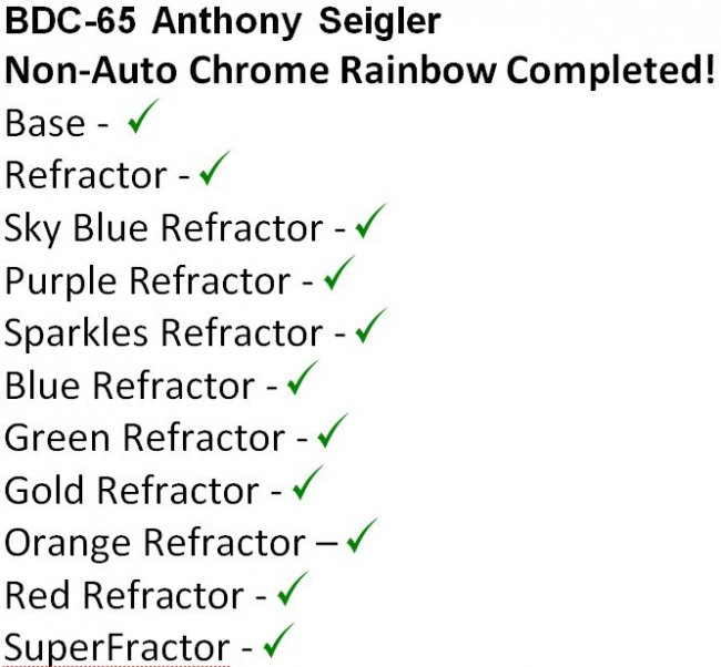I should have them early next week. 2018 - Chrome Draft Pick Autograph Anthony Seigler 2018 - Chrome Draft Pick Auto Refractor Parallel-ASeigler 2018 - Chrome Draft Pick Auto Refractor Parallel-ASeigler 2018 - Chrome Draft Pick Auto Purple Refractor Parallel-ASeigler 2018 - Chrome Draft Pick Auto Blue Refractor Parallel-ASeigler 2018 - Chrome Draft Pick Auto Blue Wave Refractor Parallel-ASeigler 2018 - Chrome Draft Pick Auto Blue Wave Refractor Parallel-ASeigler 2018 - Chrome Draft Pick Auto Green Refractor Parallel-ASeigler 2018 - Chrome Draft Pick Auto Black Refractor Parallel-ASeigler 2018 - Chrome Draft Pick Auto Sparkles Refractor Parallel-ASeigler I'm still waiting on the 50 caser and 10 caser to ship to me from Houdini. I joined a 20 caser with Dave and have tracking on that - base chrome spots for AS and RG. I joined a 20 caser with Ben and that is still filling - base chrome spots for AS and RG. Will update as soon as in hand.
