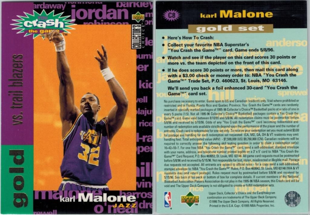 don't know why some of these cards are so rare, looking long time for this one, there are three of the GOLD version and it took me years to get the last one 1995-96 Collector's Choice Crash the Game Scoring Gold #C8 Karl Malone - Rockets 1995-96 Collector's Choice Crash the Game Scoring Gold #C8B Karl Malone - Knicks and the long time looking for 1995-96 Collector's Choice Crash the Game Scoring Gold #C8C Karl Malone - Blazers ![]() 1997-98 SP Authentic Profiles 3 #P9 Karl Malone ed#/100 ![]() 2002-03 Flair Row 2 #7 Karl Malone ed#09/25 ![]() 2003-04 Fleer Patchworks Licensed Apparel Nameplate #KM Karl Malone ed#/50 ![]() 2013-14 Immaculate Collection HOF Heroes #30 Karl Malone/60 ![]() 2013-14 Immaculate Collection Quads #21 Chris Paul/Karl Malone/Blake Griffin/John Stockton/25 ![]() 2013-14 Panini Flawless Retired Numbers Autographs #6 Karl Malone ed#/20 ![]() 2013-14 Panini Intrigue Red White and Blue Autographs #19 Karl Malone/25 ![]() 2013-14 Panini National Treasures Game Changers #7 Karl Malone ed#/60 ![]() 2013-14 Panini National Treasures Timelines Materials #4 Karl Malone/49 ![]() 2013-14 Panini National Treasures X-Factor Materials #4 Karl Malone/49 ![]() 2013-14 Panini Titanium Draft Position #191 Karl Malone/13