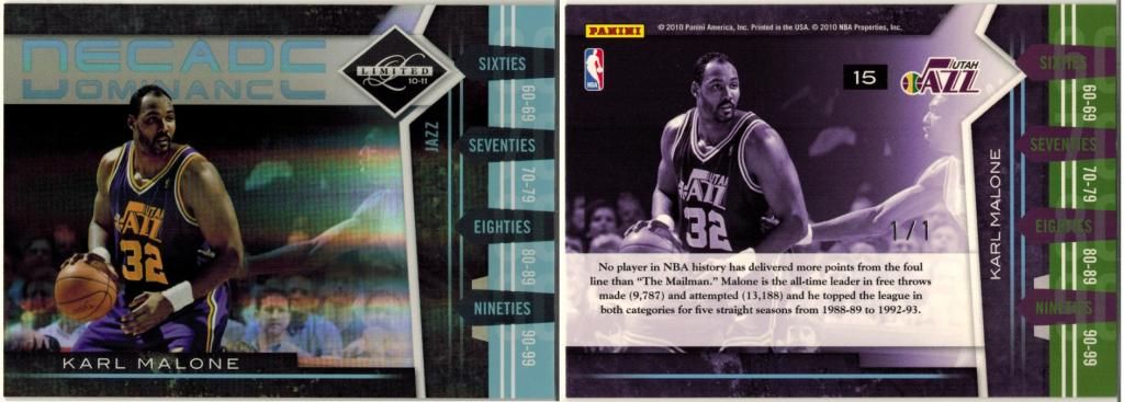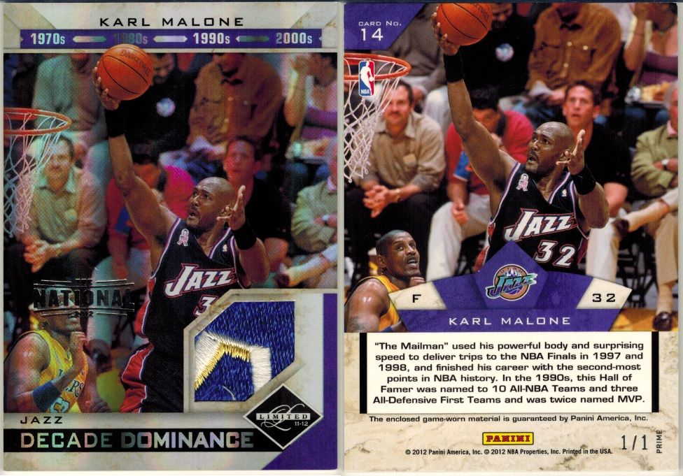 ![]() 1997-98 SP Authentic BuyBack #28 Karl Malone 95-6/36 ![]() 1999-00 E-X Essential Credentials Now #49 Karl Malone/ 49 ![]() ![]() 2010-11 Absolute Memorabilia Absolute Patches Jumbo Prime Spectrum #7 Karl Malone/10 (sadly damaged, but ok )![]() 2010-11 Limited Decade Dominance Platinum Spotlight #15 Karl Malone ed#1/1 ![]() 2012-13 Leaf Metal Faces of the Game Printing Plates Magenta #FGKM1 Karl Malone ed#1/1 ![]() 2012-13 Leaf Signature Inscriptions Printing Plates Cyan #KM1 Karl Malone ed#1/1 ![]() 2012-13 Leaf Signature Printing Plates Yellow #KM1 Karl Malone ed#1/1