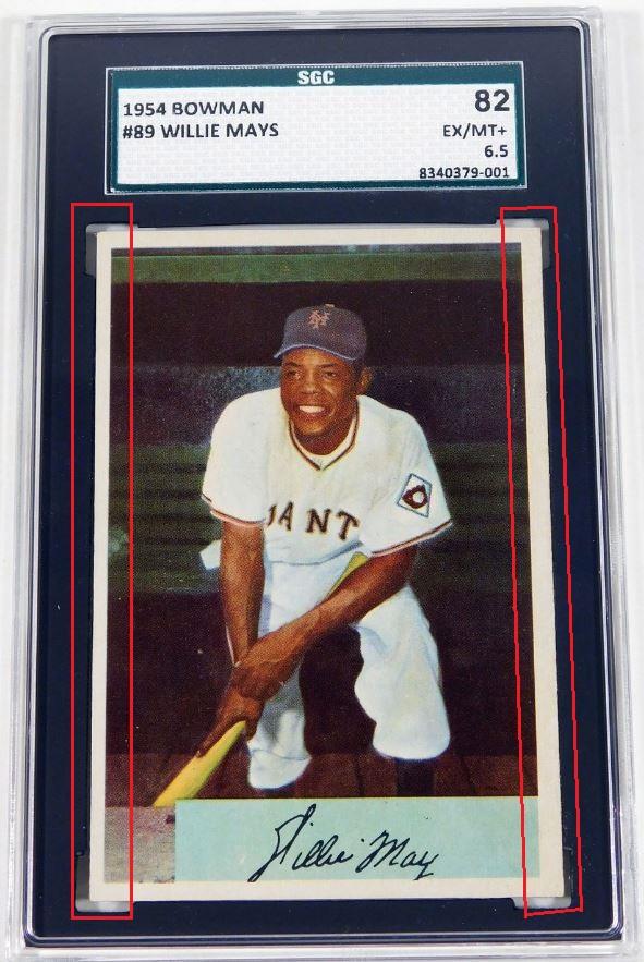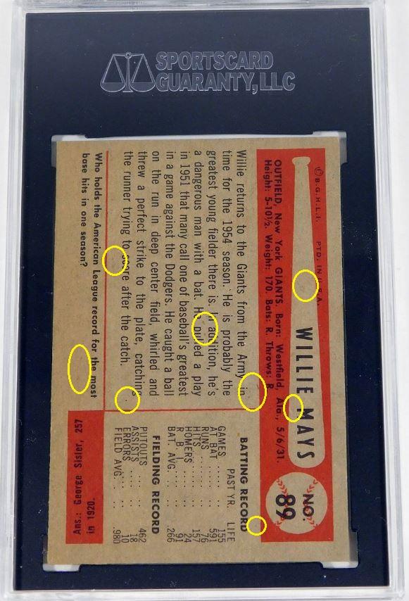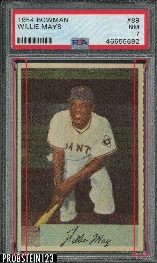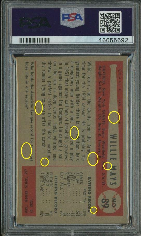 Eighteen cert #'s previously, #46655674 was also a Moser whitman111 purchase which ties masked ID v***v with Moser/Huigens cards based on them being submitted together - 5 or 6 months after the trimming scandal broke. Card was sold thru Probstein123. PSA Cert #46655692 1954 Bowman Willie Mays #89 Value gain of $530.00 PSA Set Registry: none found This card was purchased by Gary Moser (whitman111) from Ebay seller krukcards as a SGC 6.5 on November 24, 2017 for $257.00. Same card was sold by probstein123 as a PSA 7 for $787.00 on June 29, 2020. Yellow circles are print, chipping, stain or fiber identifiers. Red boxes identify trimmed left and right edges as well as fake rough cuts added. ![]() ![]() ![]()
