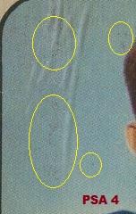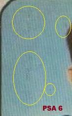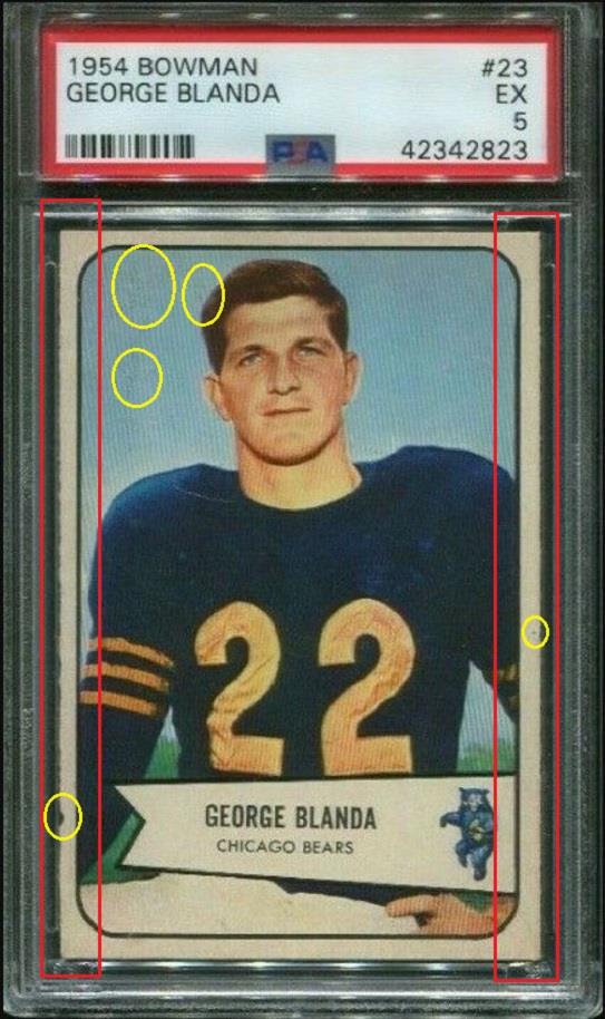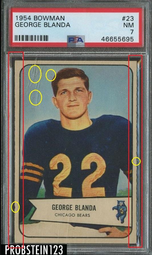 This card has had a fake rough cut added to it just like the Willie Mays card above. The Mays card was a w***1 Moser purchase and this card was a v***v purchase. and they are just three cert #'s apart. The fake rough cut is a very uncommon alteration amongst card doctors. Moser and Huigens have utilized this technique a number of times. Card was sold thru Probstein123. PSA Cert #46655695 1954 Bowman George Blanda #23 Value gain of $328.99 PSA Set Registry: PackerMania This card was purchased by unknown masked ID v***v from Ebay seller cardsandcoins as a PSA 5 on May 14, 2019 for $54.00. Same card was sold by probstein123 as a PSA 7 for $382.99 on January 14, 2021. Yellow circles are print, chipping, stain or fiber identifiers. Red boxes identify trimmed left and right edges as well as fake rough cuts added. No back image provided with probstein123 sale so I used print flaws and the large indention in the lower left border. ![]() ![]() Area of print flaws: