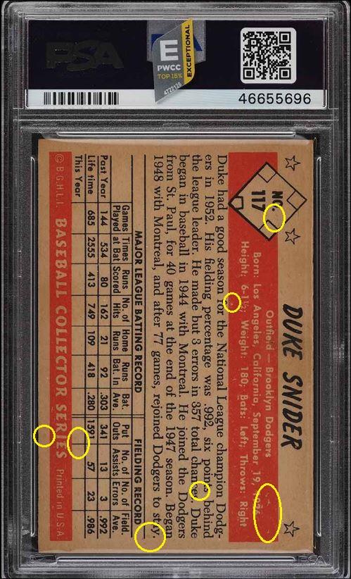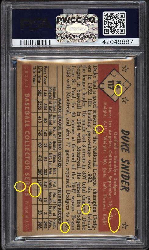 Card was altered by trimming with subtle rough edges added and received a 2 grade drop by PSA. Was sold thru PWCC with Brent Huigens once again adding a sticker to his own card. PSA Cert #46655696 1953 Bowman Color Duke Snider #117 Value LOSS of $177.48 PSA Set Registry: none found This card was purchased by Gary Moser (whitman111) from Ebay seller PWCC as a PSA 6 on December 05, 2018 for $382.98. Same card was sold by PWCC as a PSA 4 for $205.50 on September 15, 2020. Yellow circles are print, chipping, stain or fiber identifiers. Red boxes identify trimmed left and right edges. ![]() ![]() ![]()