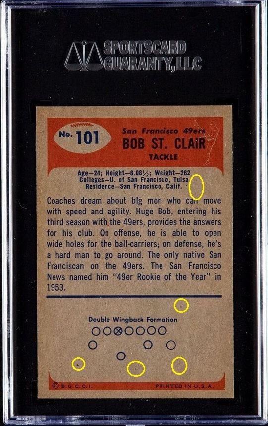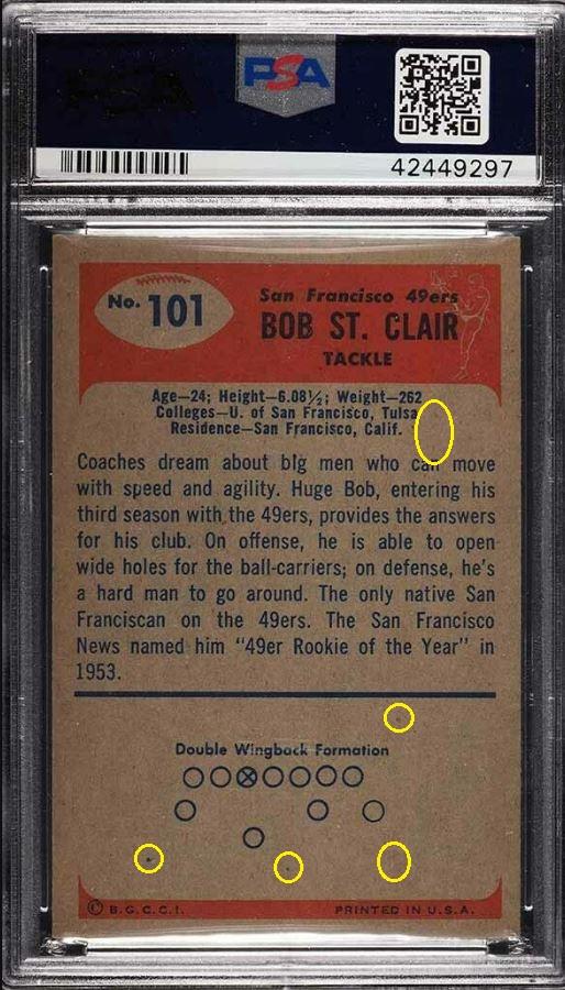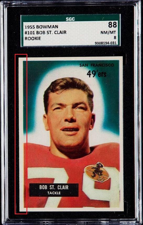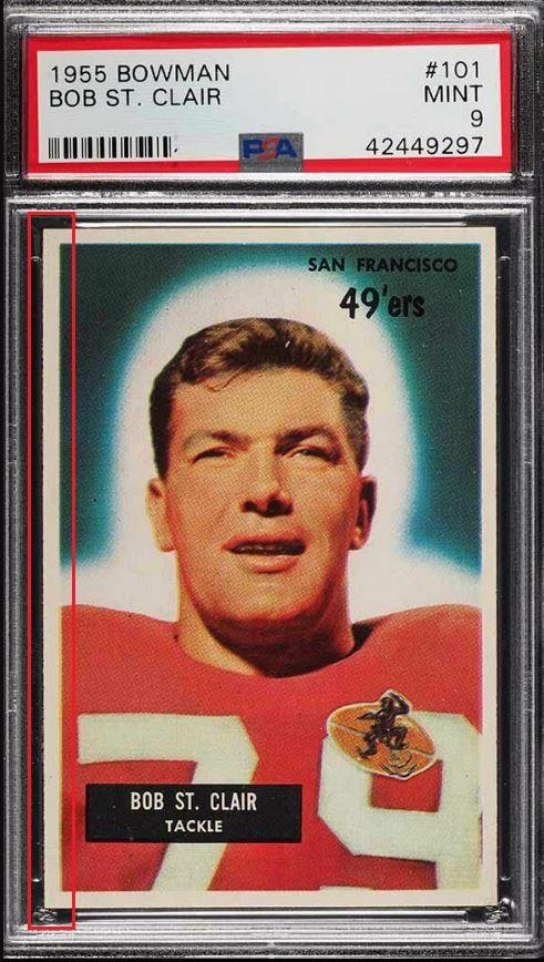PSA Cert #42449297 1955 Bowman Bob St. Clair #101 Value gain of $7,695.00 PSA Set Registry: private This card was purchased by an unknown bidder from Heritage Auctions as a SGC 8 on September 30, 2018 for $216.00. Same card was sold by PWCC as a PSA 9 for $7,911.00 on February 24, 2019. Yellow circles are print, chipping, stain or fiber identifiers. Red box identifies trimmed left edge. Left edge turned on it's side: ![]() ![]() ![]() ![]() ![]()