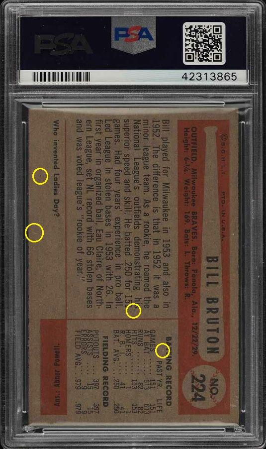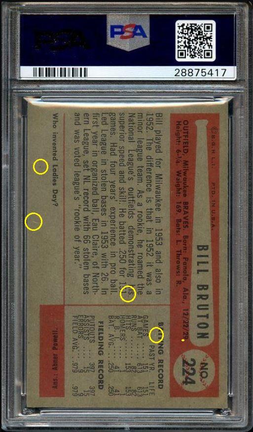 1954 Bowman William Bruton #224 Value gain of $31.24 PSA Set Registry: none found This card was purchased by Gary Moser (whitman111) from Ebay seller quality*cards as a PSA 6 on June 07, 2018 for $35.99. Same card was sold by PWCC as a PSA 7 for $67.23 on March 13, 2019. Yellow circles are print, chipping, stain or fiber identifiers. Red box identifies trimmed right edge with fake rough cut added. ![]() ![]() ![]()