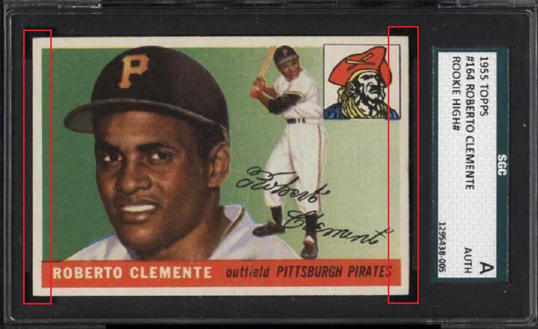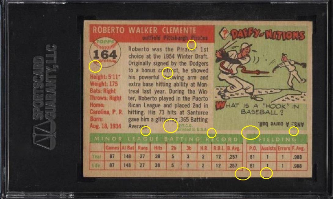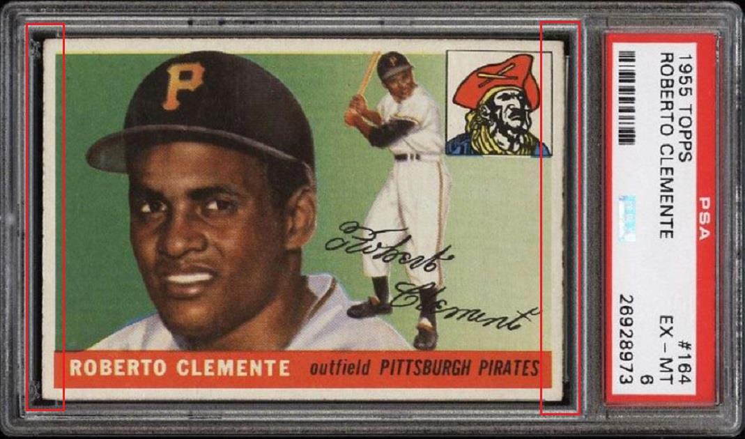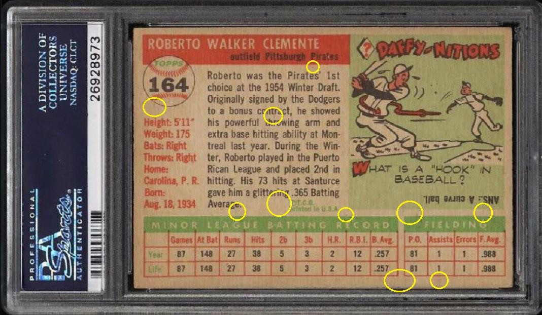 altered again by Gary Moser to achieve a PSA number grade. SGC AUTHENTIC to PSA 6 PSA Cert #26928973 1955 Topps Roberto Clemente #164 Value gain of $2,462.52 PSA Set Registry: Private This card was purchased by Gary Moser (whitman111) from Ebay seller PWCC as a SGC AUTH on November 09, 2016 for $908.69. Same card was sold by eBay seller PWCC as a PSA 6 for $3,371.21 on March 13, 2018. Card has since sold multiple times: ![]() Yellow circles are print, chipping, stain or fiber identifiers. Red boxes identify added rough cut and "worn" left and right edges. ![]() ![]() ![]() ![]() ![]() ![]()