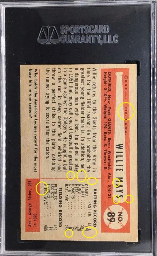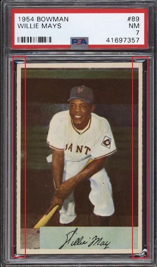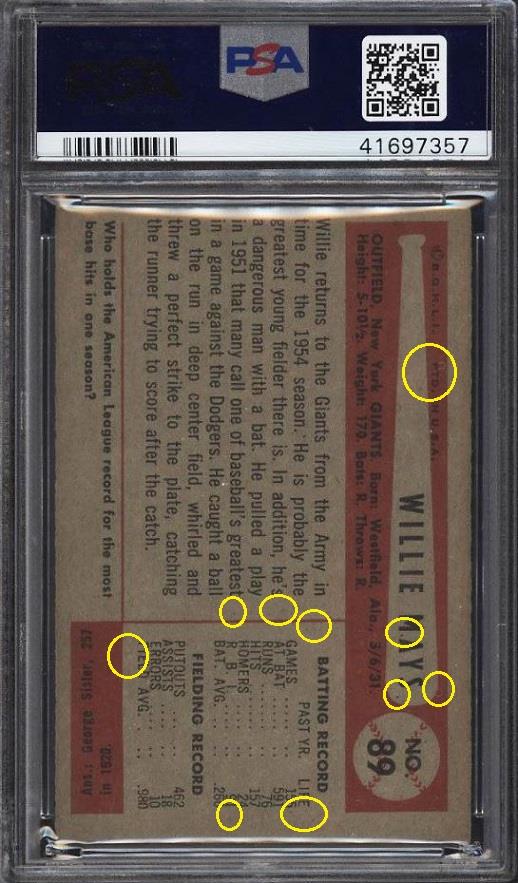 PSA Cert #41697357 1954 Bowman Willie Mays #89 Value gain of $475.00 PSA Set Registry: None found This card was purchased by Gary Moser (whitman111) from Ebay seller globalcoincollector as a SGC 6 on October 29, 2017 for $330.00. Same card was sold by PWCC as a PSA 7 for $805.00 on November 11, 2018. Yellow circles are print, chipping, stain or fiber identifiers. Red boxes identify trimmed left and right edges. ![]() ![]() ![]()