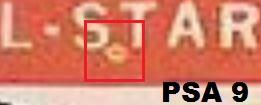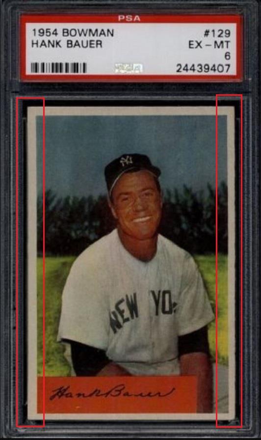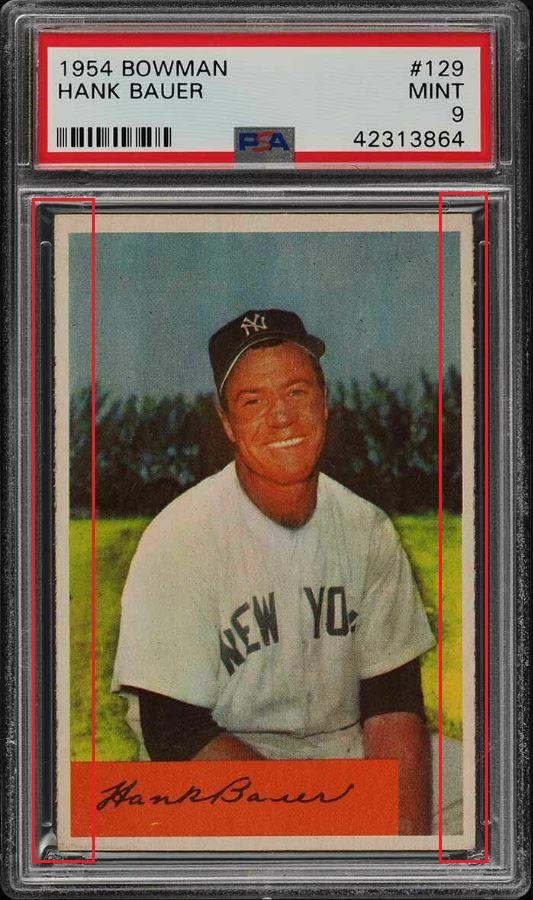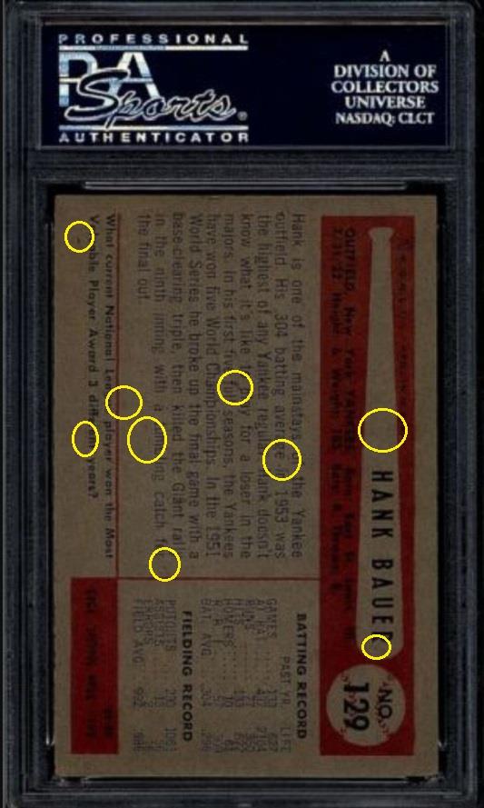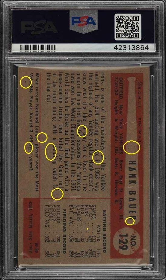 PSA Cert #42313864 1954 Bowman Hank Bauer #129 Value gain of $2,191.37 PSA Set Registry: olemiss This card was purchased by Gary Moser (whitman111) from Ebay seller mscrazyyetti as a PSA 6 on September 16, 2018 for $19.48. Same card was sold by PWCC as a PSA 9 for $2,210.85 on March 13, 2019. Yellow circles are print, chipping, stain or fiber identifiers. Red boxes identify trimmed left and right edges. ![]() ![]() ![]()