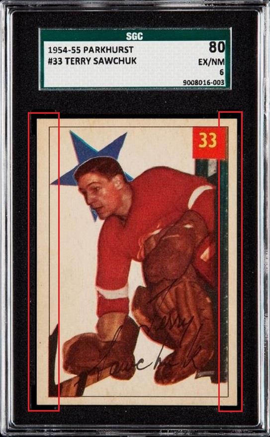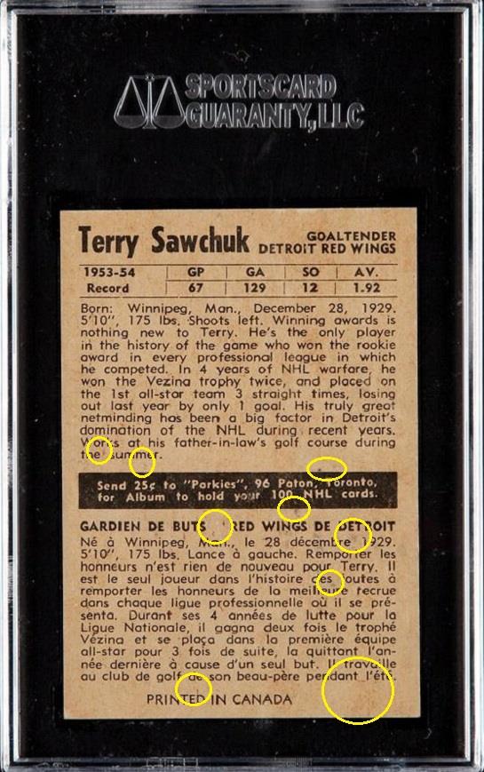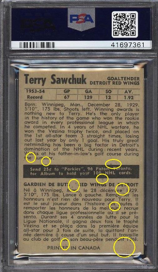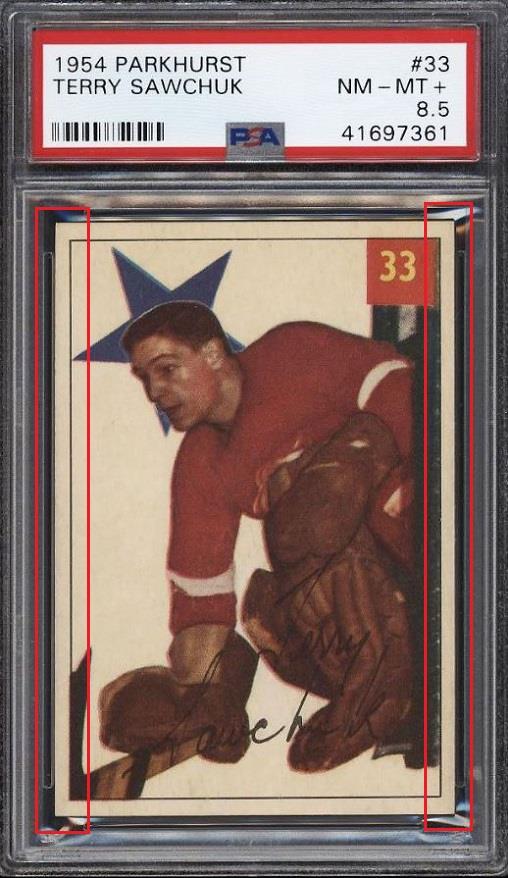 PSA Cert #41697361 1954 Parkhurst Terry Sawchuk #33 Value gain of $3,732.00 PSA Set Registry: Private This card was purchased by Gary Moser (whitman111) from Heritage Auctions as a SGC 6 on April 08, 2018 for $144.00. Same card was sold by PWCC as a PSA 8.5 for $3,876.00 on November 19, 2018. Yellow circles are print, chipping, stain or fiber identifiers. Red boxes identify trimmed left and right edges. ![]() ![]() ![]()