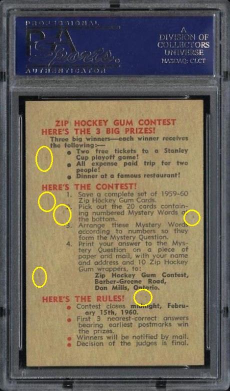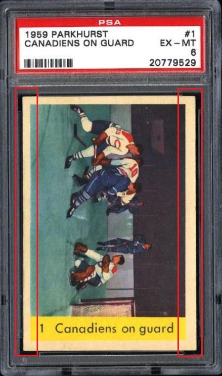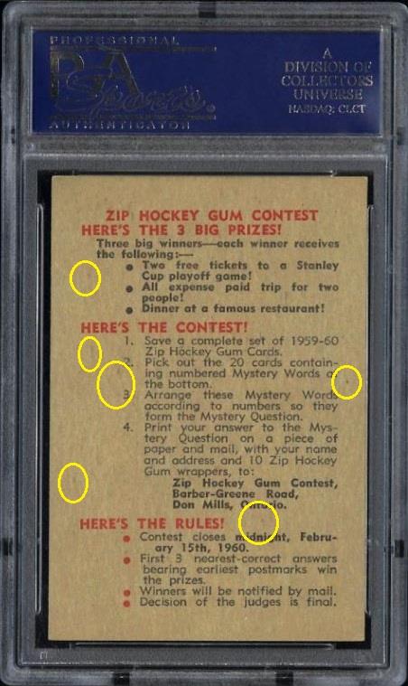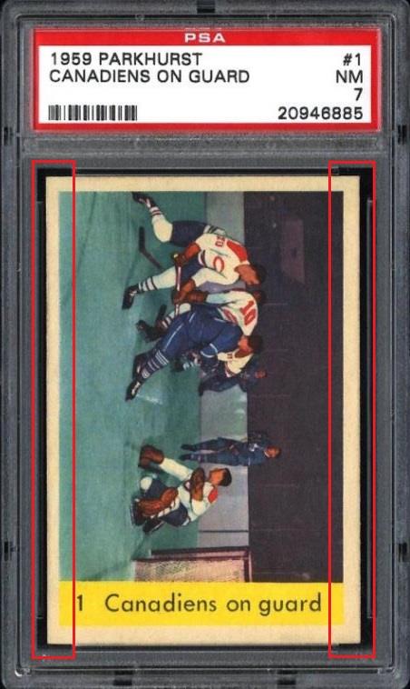 PSA Cert #20946885 1959 Parkhurst Canadiens On Guard #1 Value gain of $39.77 PSA Set Registry: kalibontu This card was purchased by Gary Moser (whitman111) from Ebay seller PWCC as a PSA 6 on December 09, 2012 for $53.23. Same card was sold by PWCC as a PSA 7 for $93.00 on April 07, 2013. Yellow circles are print, chipping, stain or fiber identifiers. Red boxes identify trimmed left and right edges (as viewed). ![]() ![]() ![]()